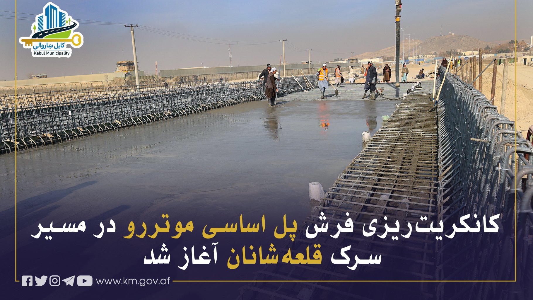 کار کانکریتریزی فرش پل اساسی موتررو بالای دریای کابل در مسیر سرک جدید قلعهشانان، پس از تکمیل مراحل سیخپیچی، از سوی ریاست کار، حفظ و مراقبت شاروالی کابل آغاز گردیده است.