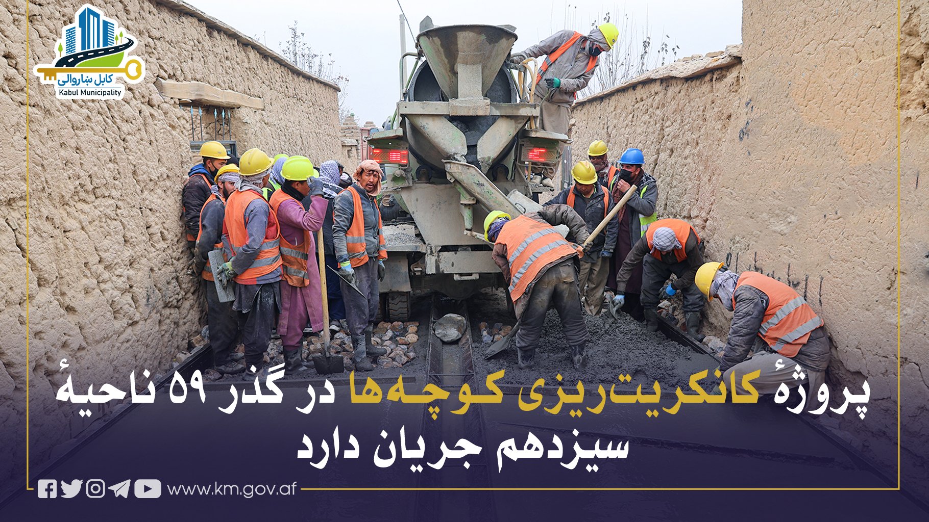پروژهٔ کانکریتریزی سه کوچه در ساحهٔ مسجد مهدیه، مربوط گذر ۵۹ ناحیهٔ سیزدهم، به طول ۱۳۰۰ متر و با عرضهای ۳ تا ۴ متر در حال اجرا بوده و تلاش میشود در صورت مساعد بودن شرایط آبوهوا، در زمان تعیینشده تکمیل گردد.