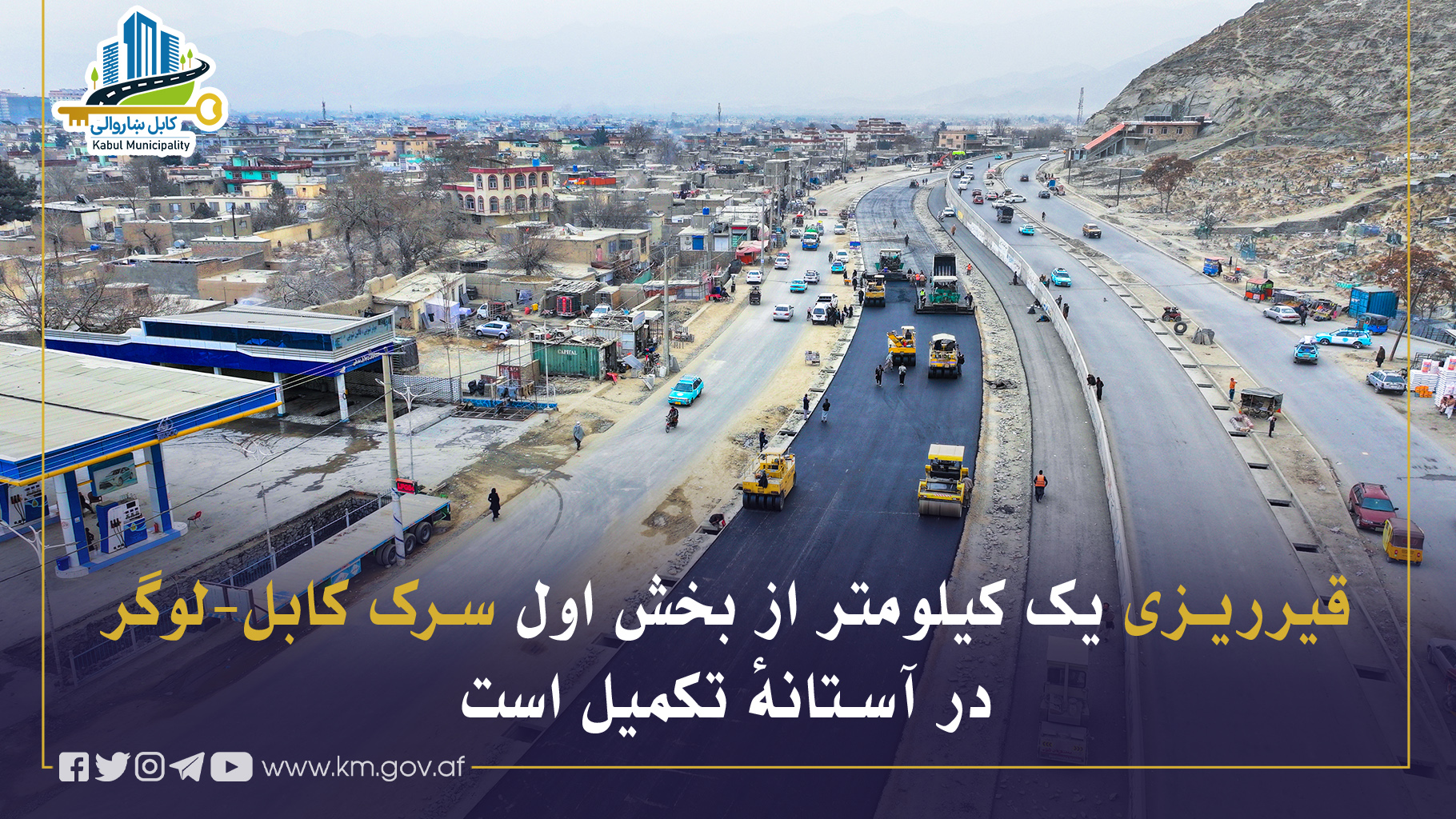کار قیرریزی یک کیلومتر دیگر از بخش اول سرک کابل–لوگر، پس از تکمیل زیرساختها و بدنهٔ خاکی، با پیشرفت چشمگیر در حال نهاییشدن است.
