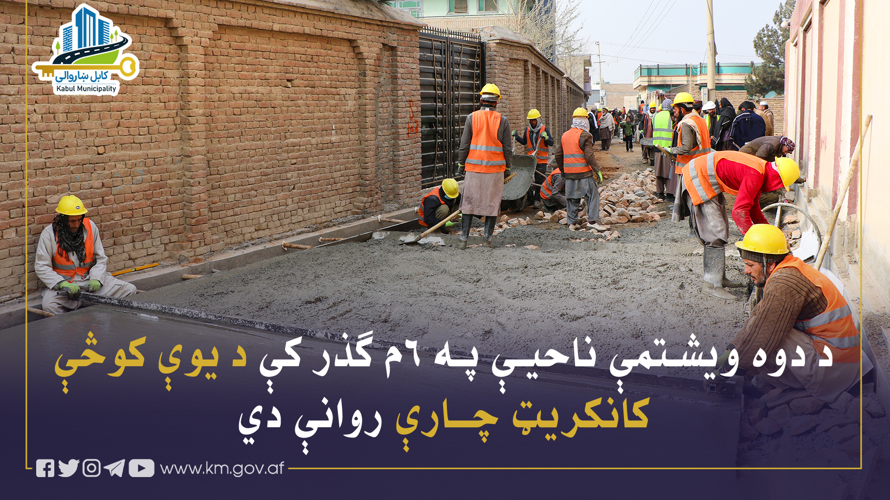 د کابل ښاروالۍ له لوري د ملګرو ملتونو د پروژوي خدمتونو د دفتر په مرسته د دوه ویشتمې ناحیې د ۶م ګذر اړوند په حسین خیلو سیمه کې د یوې کوڅې کانکرېټ چارې روانې دي او ټاکل شوې ده تر راتلونکې یوې اونۍ پورې بشپړې شي.