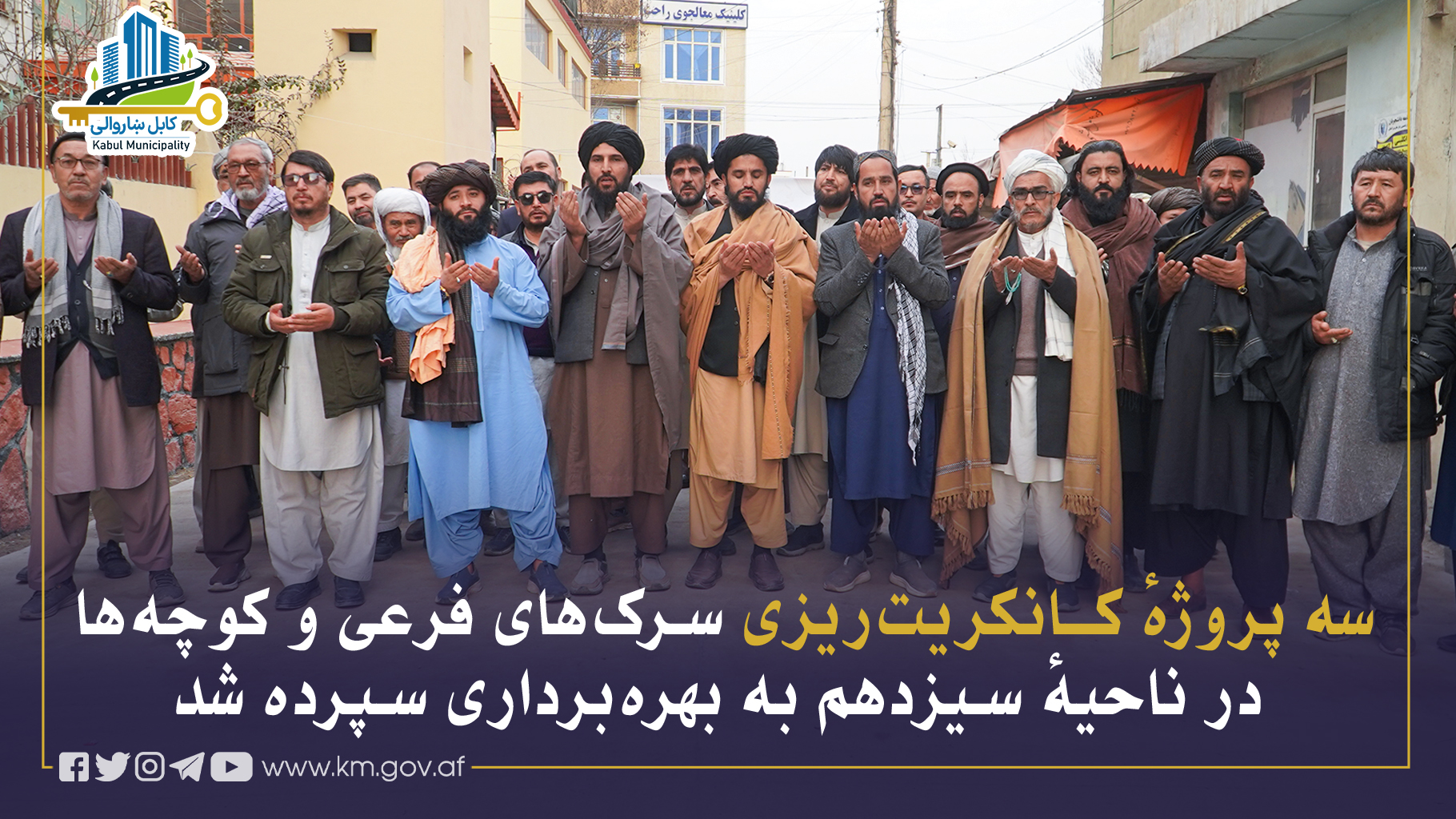 سه پروژهٔ کانکریتریزی سرکهای فرعی و کوچهها در گذرهای ۳، ۱۱ و ۳۳ ناحیهٔ سیزدهم، بهارزش مجموعی ۲۲.۷ میلیون افغانی تکمیل گردیده و با حضور انجنیر میرالرحمن “ناصری”، رئیس تنظیم برنامهها و پروژههای شاروالی کابل، مولوی عبدالصمد “عابد” رئیس ناحیهٔ سیزدهم، بزرگان محل و نمایندگان اهالی، به بهرهبرداری سپرده شد.