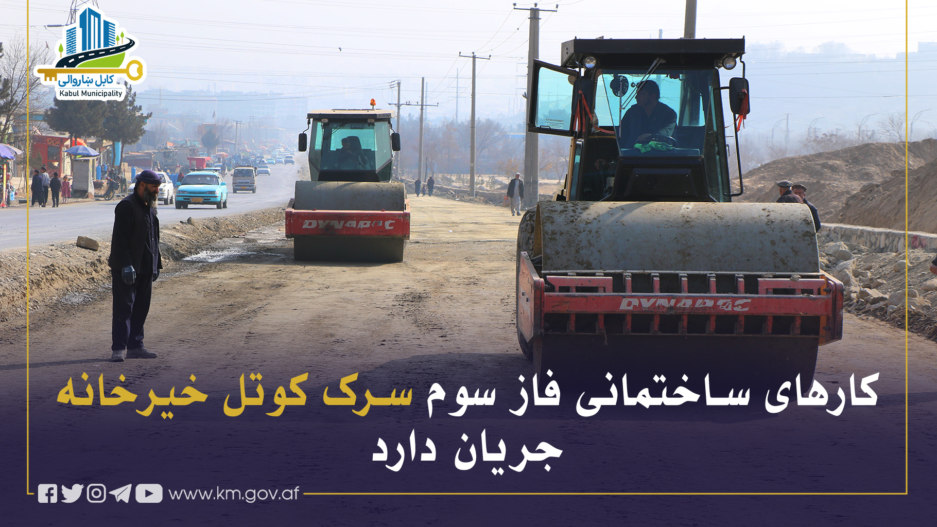 کار بخشهای مختلف فاز سوم سرک کوتل خیرخانه از سوی ریاست کار، حفظ و مراقبت شاروالی کابل بهگونه منظم ادامه دارد.
