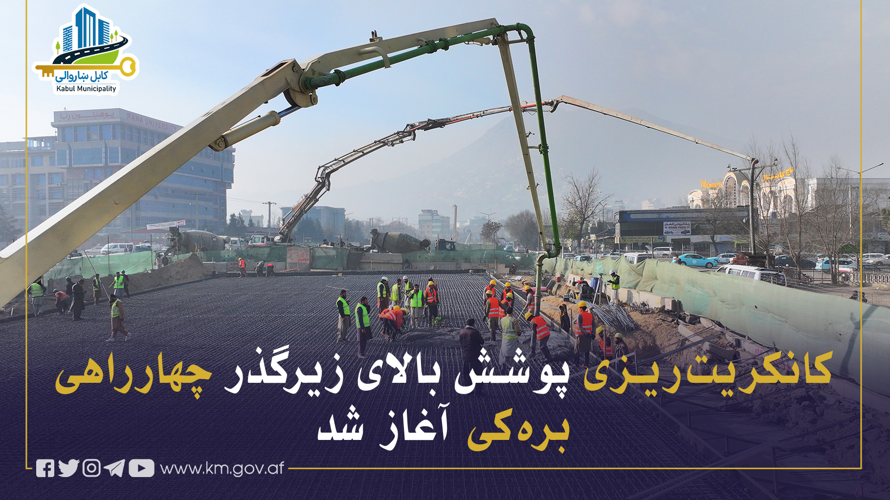پس از تکمیل نصب گادرهای پیشساخت و تکمیل پروسه های سیخبندی و قالب بندی کار کانکریتریزی پوشش یک سمت زیرگذر چهارراهی برهکی به مساحت ۱۱۲۰مترمربع از سوی ریاست کار، حفظ و مراقبت شاروالی کابل آغاز گردید.