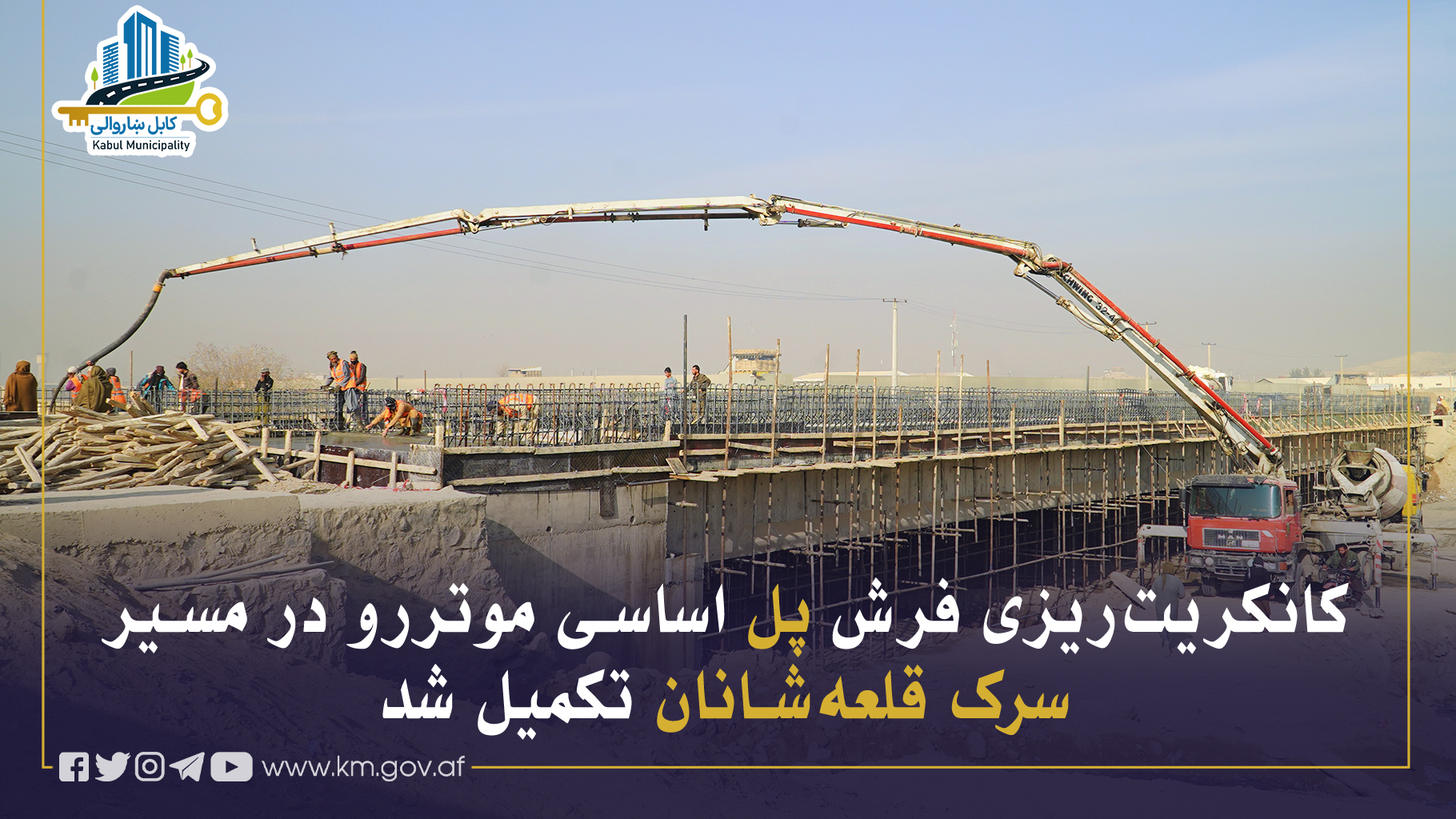 کار کانکریتریزی فرش پل اساسی موتررو بالای دریای کابل، در مسیر سرک جدید قلعهشانان توسط ریاست کار، حفظ و مراقبت شاروالی کابل با موفقیت تکمیل گردیده و قرار است پس از سپریشدن زمان لازم برای استحکام، بهروی ترافیک بازگشایی شود.