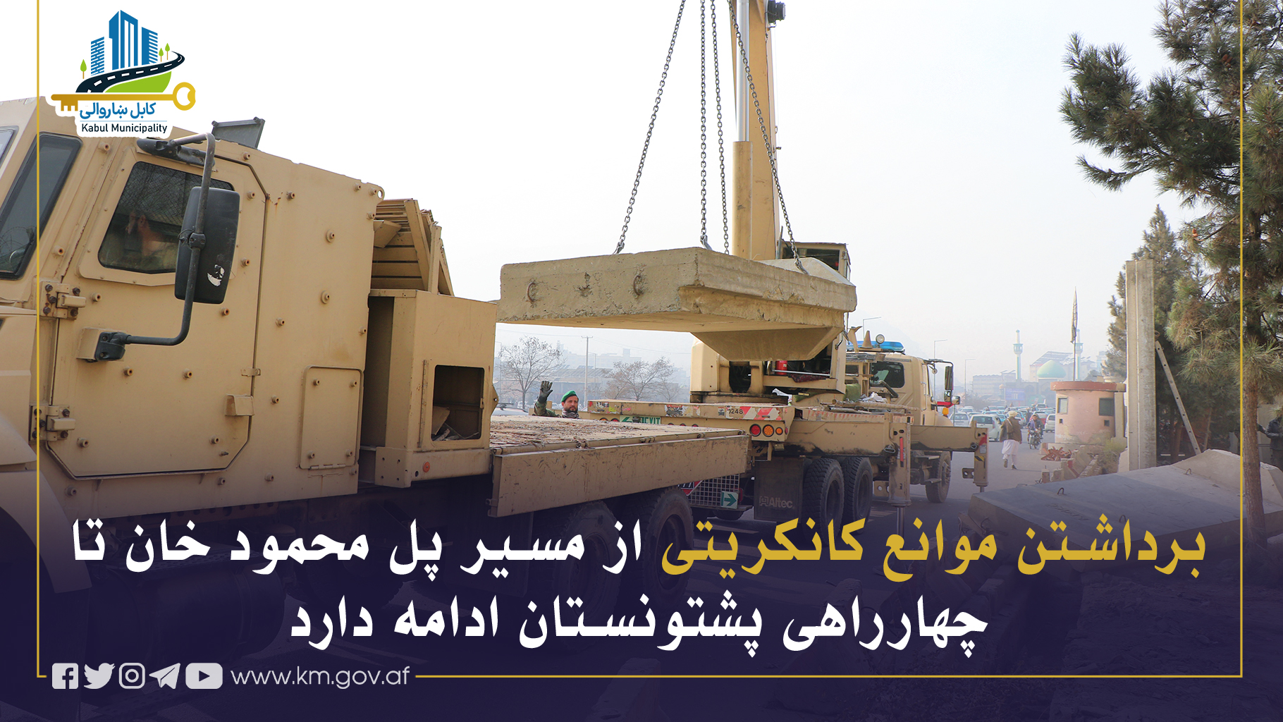 روند برداشتن موانع کانکریتی از مسیر سرک پل محمود خان تا چهارراهی پشتونستان همچنان ادامه دارد. این اقدام که از سوی کمیتهٔ موظف رویدست گرفته شده، با استقبال گستردهٔ شهروندان همراه بوده است.