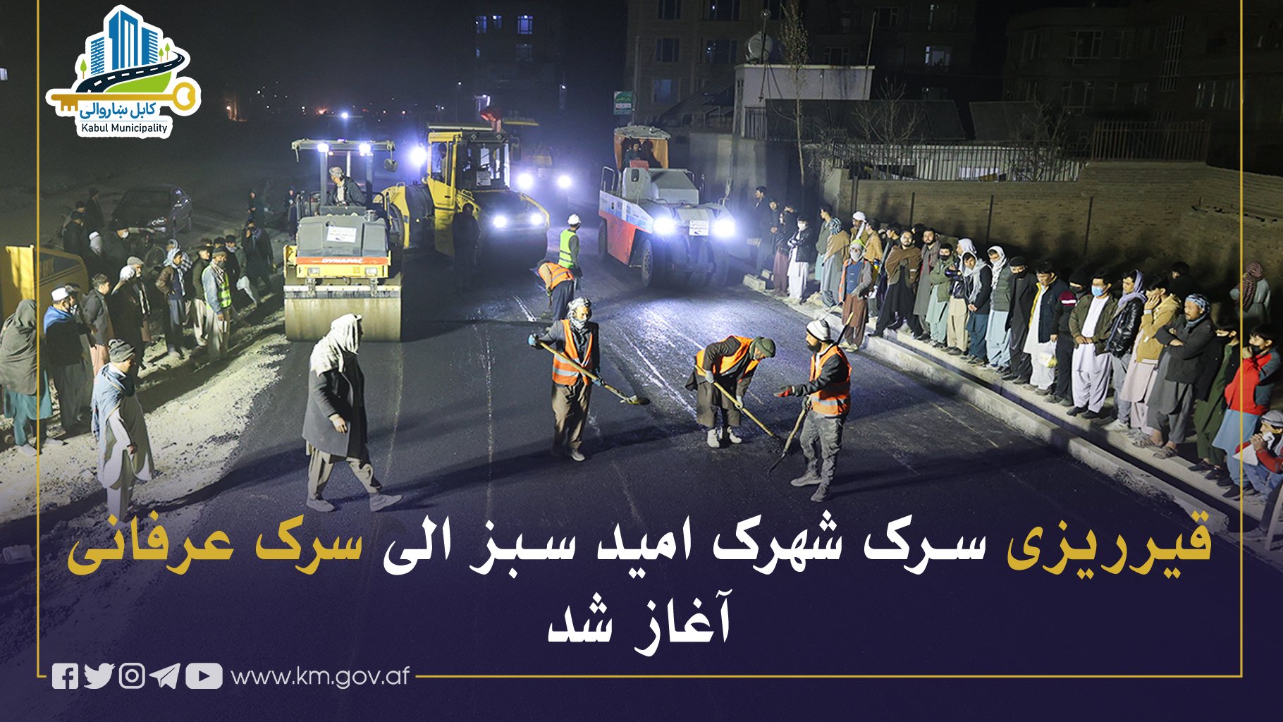 پس از تکمیل ساخت طبقات اساسی، قیرریزی ۱۵۰۰ متر از سرک شهرک امید سبز الی سرک عرفانی در مربوطات ناحیهٔ سیزدهم آغاز گردیده است.