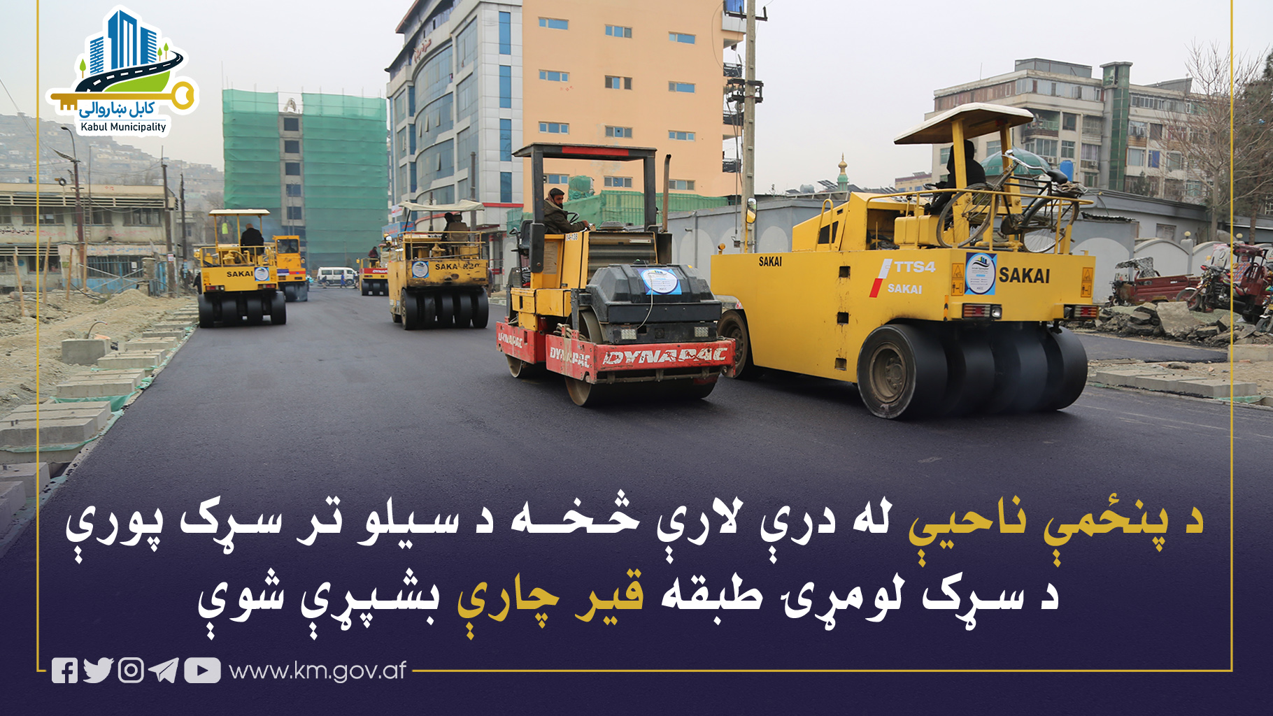 د پنځمې ناحیې له درې لارې څخه د سیلو تر سړک پورې د قطریانو ښارګوټي جنوب خوا ته د ۴۷۲ مترو په اوږدوالي او د ۲۰ مترو په سور سره د سړک لومړۍ طبقه قیر چارې بشپړې شوې او یاد سړک به ډیر ژر د ترافیکو پرمخ پرانیستل شي.