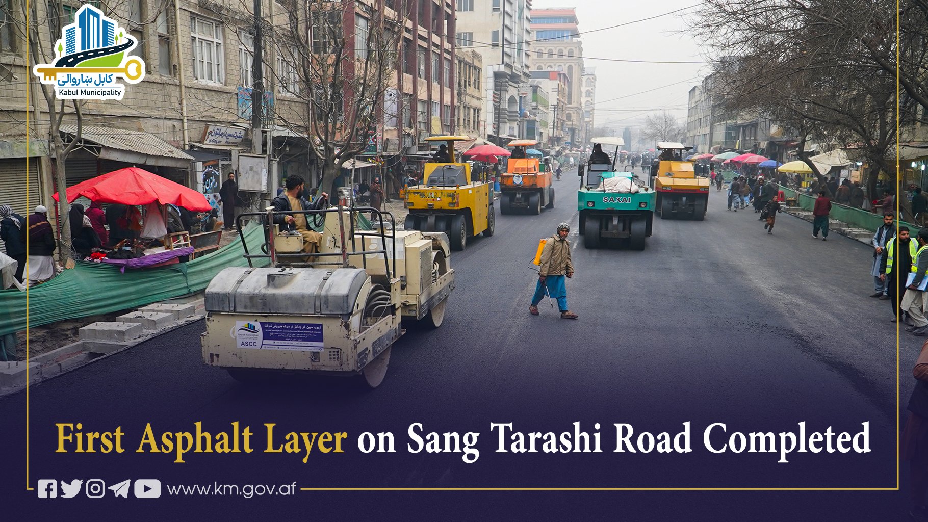 The first asphalt layer has been completed on Sang Tarashi (Shor Bazaar) Road, stretching from Sepahi Gumnam Square (Abda-e Maiwand) to Bagh-e Qazi Road in District 1. The road is expected to be opened to traffic in the near future.