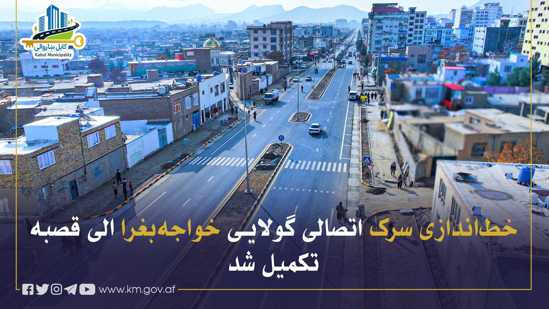 خط اندازی سرک اتصالی جدید از گولایی خواجه بغرا الی سرک قصبه در مربوطات ناحیه پانزدهم صورت گرفت که شامل ترسیم خطوط متصل، منقطع، دهلیز پیادهرو و علائم ترافیکی است.