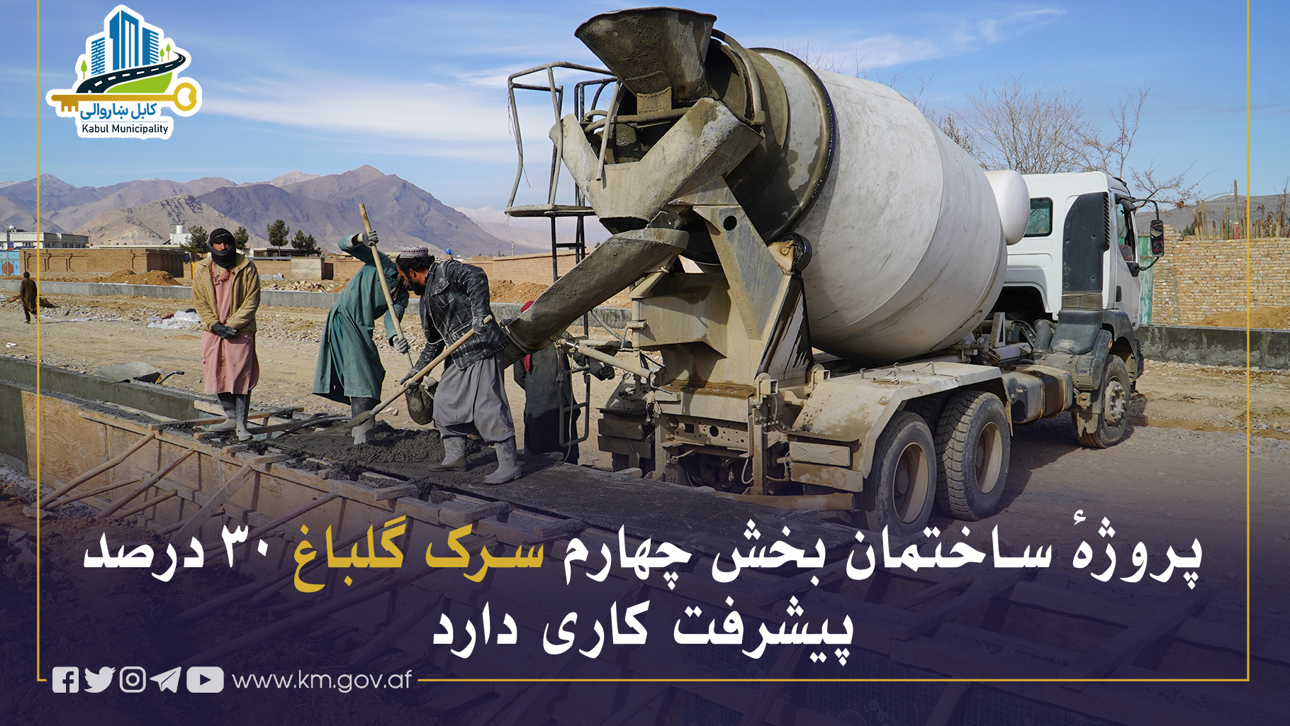 پروژهٔ ساختمان بخش چهارم سرک گلباغ از ساحهٔ چهلدختران تا سرک کابل–لوگر در مربوطات ناحیهٔ بیستم، که چندی قبل از سوی شاروالی کابل آغاز گردیده بود، تاکنون ۳۰ درصد پیشرفت کاری داشته است.