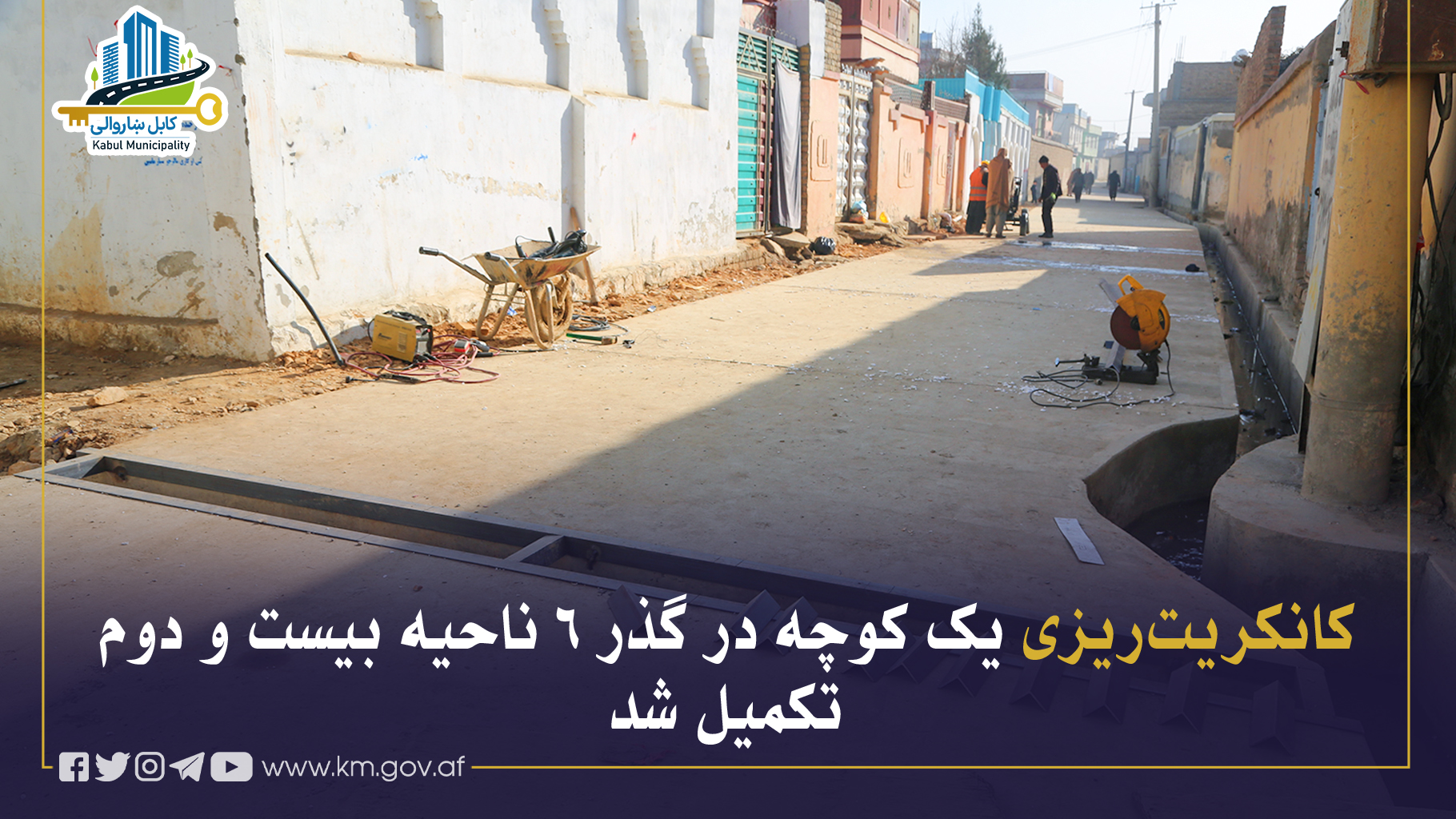 کانکریتریزی یک کوچه در ساحه حسین خیل مربوط گذر ۶ ناحیه بیست و دوم بهطول ۵۱۸ متر و با عرض ۵ متر از سوی شاروالی کابل با همکاری دفتر پروژوی سازمان ملل متحدتکمیل گردید.