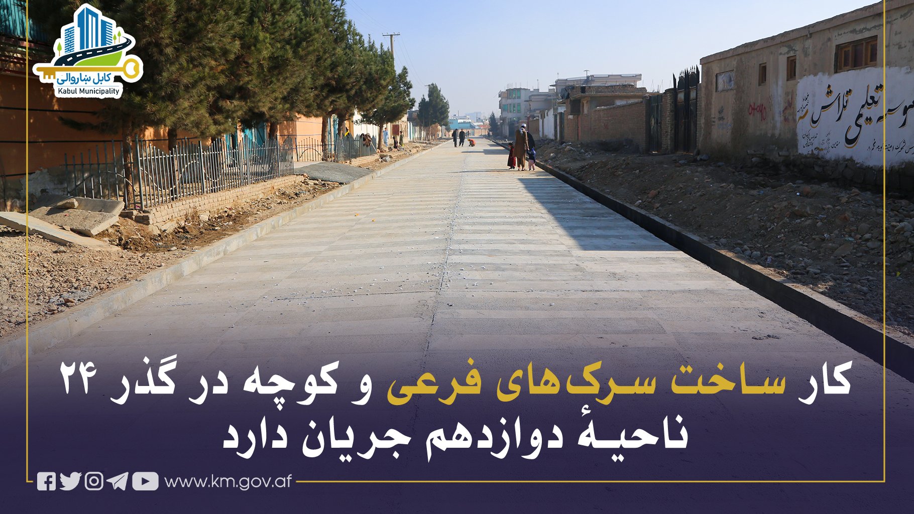 کار ساخت سه سرک فرعی و یک کوچه در ساحهٔ شهرک امنیت، مربوط گذر ۲۴ ناحیهٔ دوازدهم، از سوی شاروالی کابل و با همکاری دفتر پروژوی سازمان ملل متحد جریان دارد.