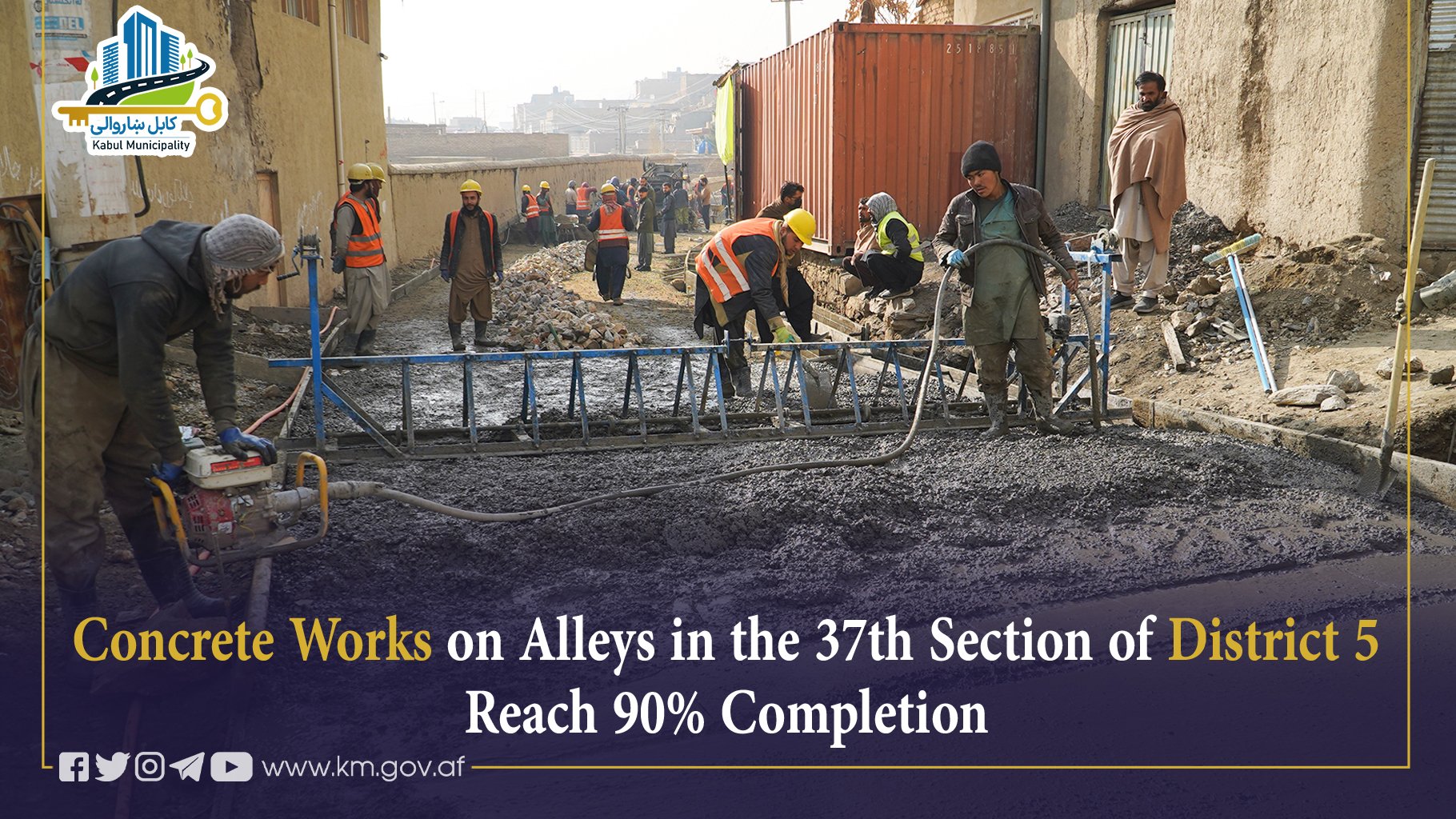 In compliance with UNOPS, Kabul Municipality reports that concrete works on four alleys in the 37th Section of District 5, located in the Ghazi Mohammad Jan Khan Township area, have reached 90 percent completion.