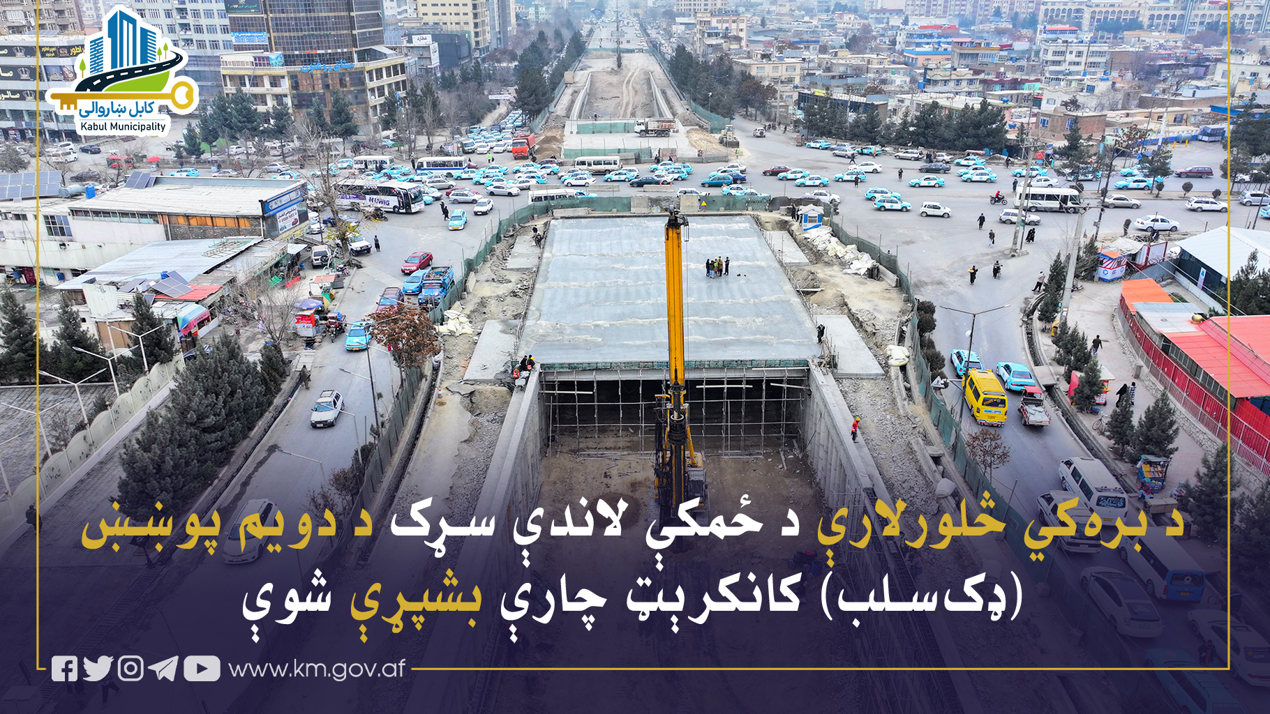 د کابل ښاروالۍ د کار، ساتنې او مراقبت ریاست د دوامداره هڅو په پایله کې د نادریې لېسې خوا ته د بره کي په څلورلارې کې تر ځمکې لاندې سړک د دویم پوښښ(دک سلب) کانکرېټ چارې په بریالیتوب سره بشپړې شوې.