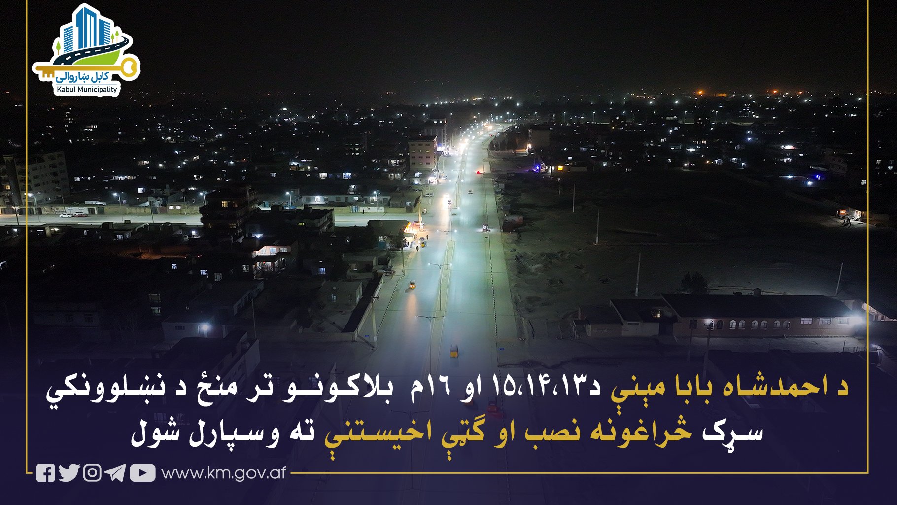د دولسمې ناحیې اړوند د احمدشاه بابا مېنې د ۱۳، ۱۴، ۱۵ او ۱۶م بلاکونو ترمنځ د نښلوونکي سړک د څراغونو د نصبولو چارې بشپړې او ګټې اخیستنې ته وسپارل شول.