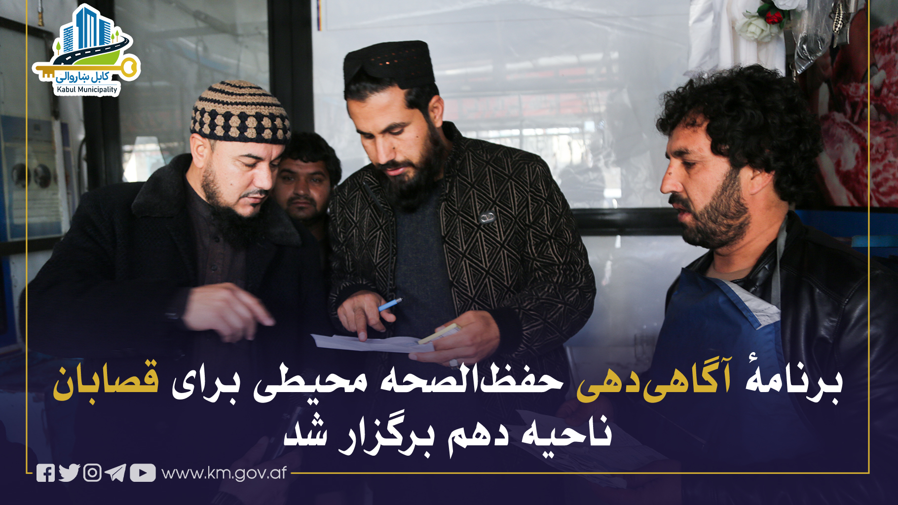 بهمنظور تأمین حفظالصحه محیطی و ارتقای آگاهی صنفی، برنامهٔ آگاهیدهی برای قصابان ناحیهٔ دهم از سوی ریاست نشرات و آگاهی عامه شاروالی کابل، با همکاری ناحیهٔ مربوطه برگزار گردید.