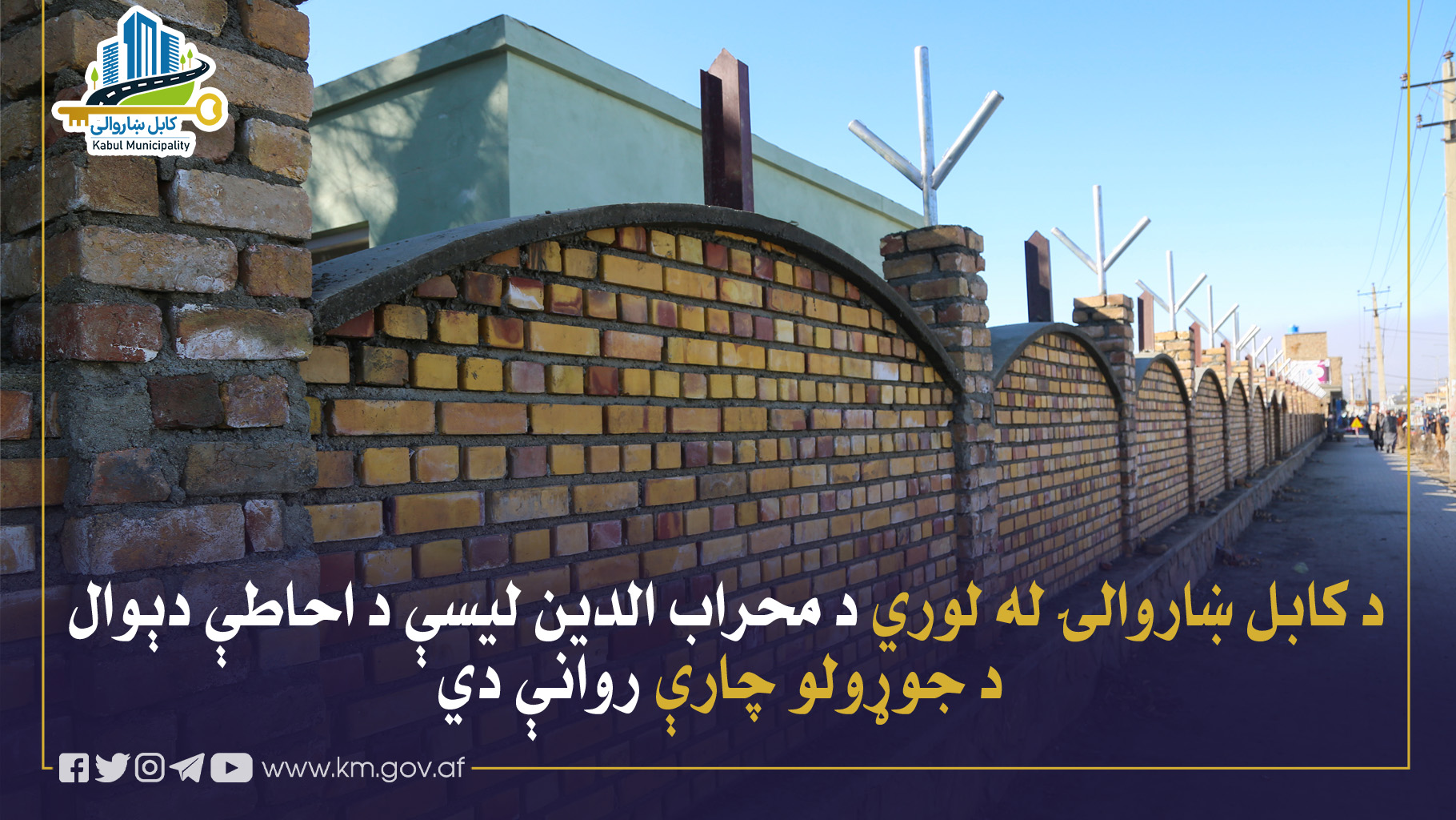 د کابل ښاروالۍ د کار، ساتنې او مراقبت ریاست له خوا د ۱۸۴ مترو په اوږدوالي او ۳ مترو په لوړوالي سره د اوومې ناحیې اړوند د محراب الدین لېسې د احاطې دېوال د جوړولو چارې په معیاري توګه روانې دي او تر راتلونکې یوې اونۍ پورې به بشپړې شي.