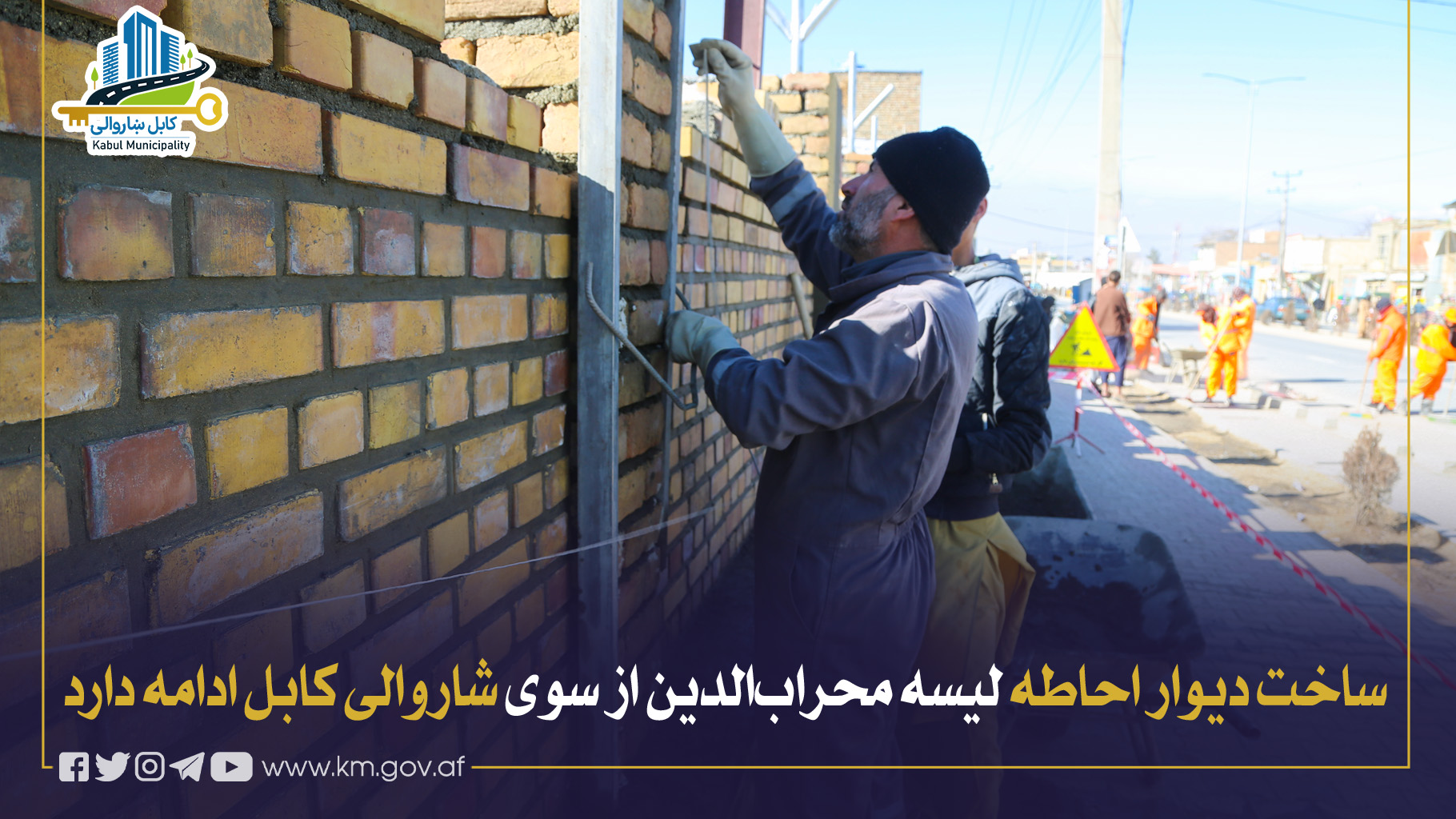 کار ساخت دیوار احاطهٔ لیسهٔ محرابالدین در مربوطات ناحیهٔ هفتم، بهطول ۱۸۴ متر و ارتفاع ۳ متر، با جدیت از سوی ریاست کار، حفظ و مراقبت شاروالی کابل جریان داشته و بهگونهٔ معیاری تا یک هفتهٔ آینده تکمیل خواهد شد.