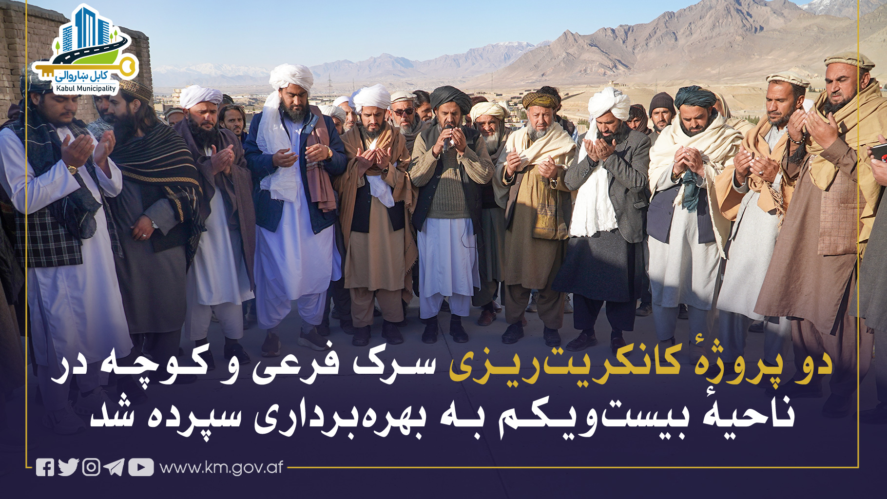 دو پروژهٔ کانکریتریزی سرک فرعی و کوچه در گذرهای ۲۲ و ۳۴ ناحیهٔ بیستویکم، بهارزش مجموعی ۱۹.۵ میلیون افغانی تکمیل گردیده و با حضور انجنیر میرالرحمن “ناصری” رئیس تنظیم برنامهها و پروژههای شاروالی کابل، مولوی عبدالروف رئیس ناحیهٔ بیستویکم، بزرگان محل و نمایندگان اهالی، بهبهرهبرداری سپرده شد.
