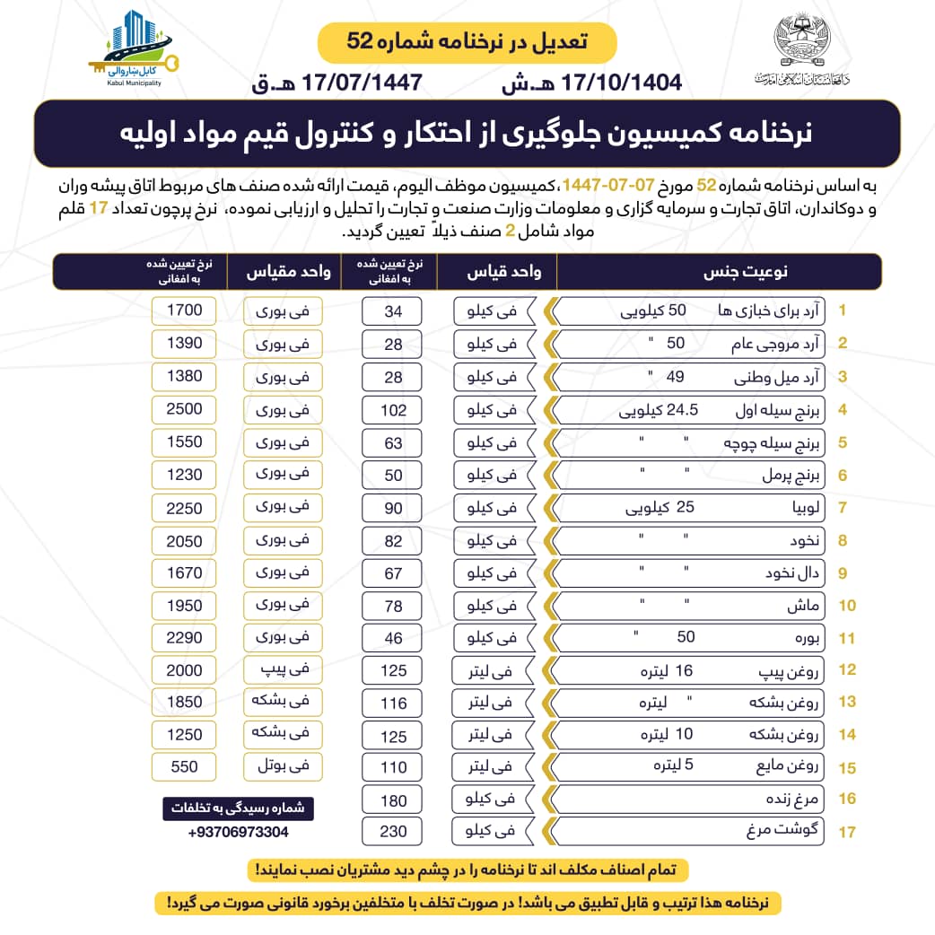 د نرخونو د کنټرول او له احتکار څخه د مخنیوي کمیسیون د ۵۲ مې ګڼې نرخنامې تعدیل
