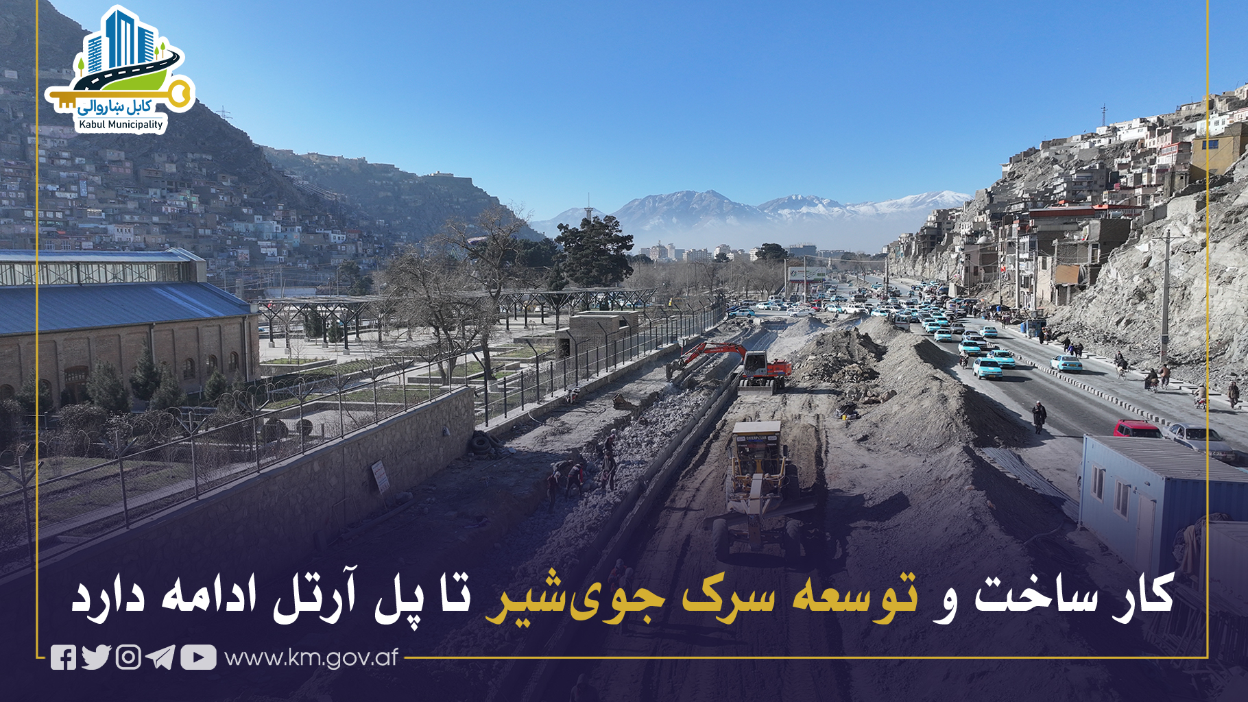 بهمنظور کاهش ازدحام ترافیکی و توسعه زیربناهای شهری، کار ساخت و توسعه سرک از جویشیر تا پل آرتل ادامه داشته که شامل ساخت طبقات اساسی سرک متذکره میباشد تا این مسیر در بهار سال آینده آماده قیرریزی گردد.