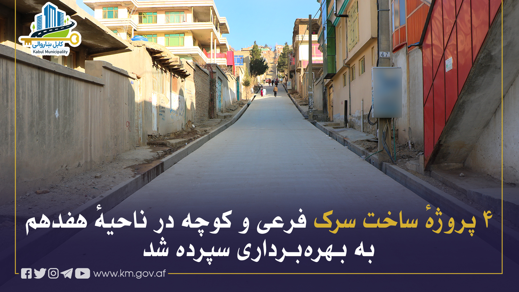 پروژههای کانکریتریزی سرکهای فرعی و کوچهها در گذرهای ۱۹، ۲۹، ۳۰ و ۳۲ ناحیهٔ هفدهم تکمیل گردیده و با حضور انجنیر میرالرحمن “ناصری” رئیس تنظیم برنامهها و پروژههای شاروالی کابل، مولوی حبیبالحق “حقانی” رئیس ناحیهٔ هفدهم، بزرگان محل و باشندگان ساحه، رسماً بهبهرهبرداری سپرده شد.