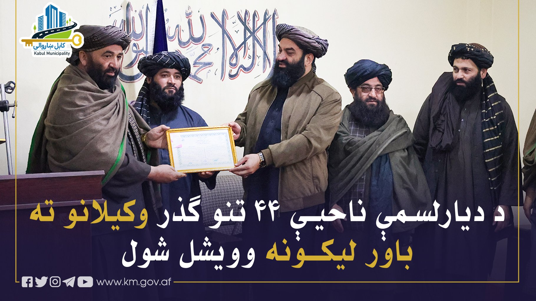 د کابل ښاروالۍ د ولسي او ټولنیزو چارو د همغږۍ ریاست له خوا د دیارلسمې ناحیې ۴۴ تنو ګذر وکیلانو ته د وکالت باور لیکونه وویشل شول.