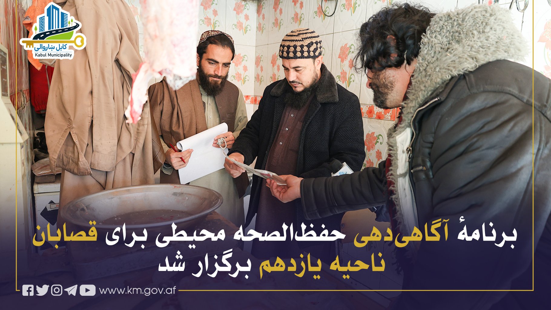 بهمنظور تأمین حفظالصحه محیطی و ارتقای آگاهی صنفی، برنامهٔ آگاهیدهی برای قصابان ناحیهٔ یازدهم از سوی ریاست نشرات و آگاهی عامه شاروالی کابل، با همکاری ناحیهٔ مربوطه برگزار گردید.