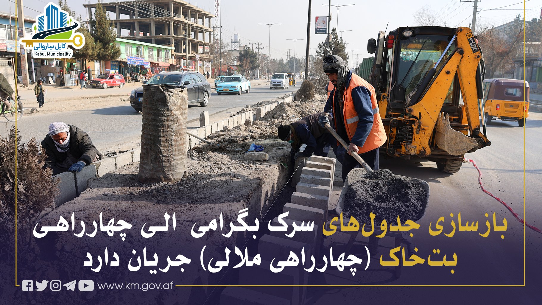 کار بازسازی جدولهای سرک بگرامی تا چهارراهی بتخاک (چهارراهی ملالی) از سوی ریاست کار، حفظ و مراقبت شاروالی کابل جریان دارد که در تنظیم و تقسیم جریان ترافیک، ایجاد زیبایی شهری و توسعهٔ گلدانها از اهمیت ویژه برخوردار میباشد.