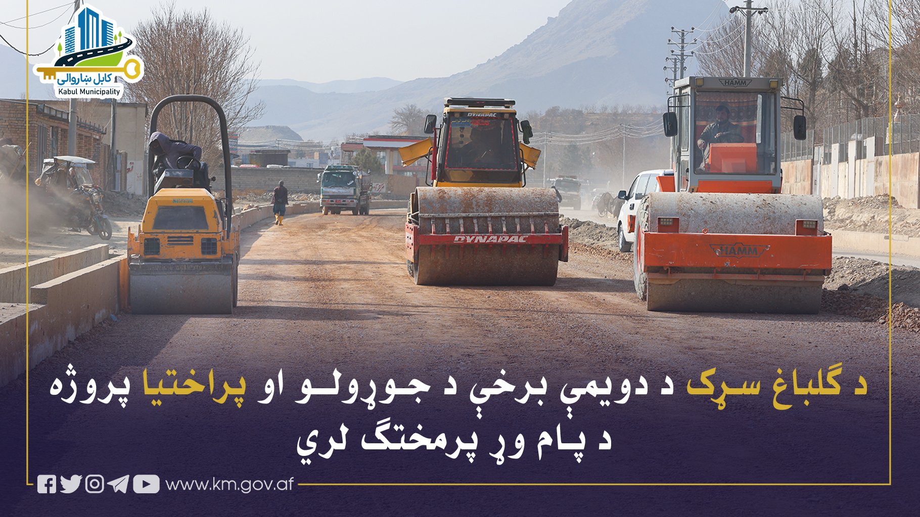 د ګلباغ سړک د دویمې برخې د جوړولو چارې چې، په روان کال کې د کابل ښاروالۍ له خوا پیل شوې وې د پام وړ کاري پرمختګ لري او د هوا د ښه والي په صورت کې به یې قیر چارې هم پیل شي.