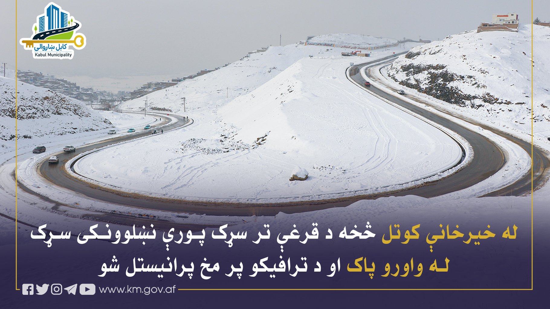 د کابل ښاروالۍ د زیارکښه کارکوونکو له خوا، له خیرخانې کوتل څخه د قرغې تر سړک پورې نوی نښلوونکی سړک له واورو پاک او د ترافیکو پر مخ پرانیستل شو.