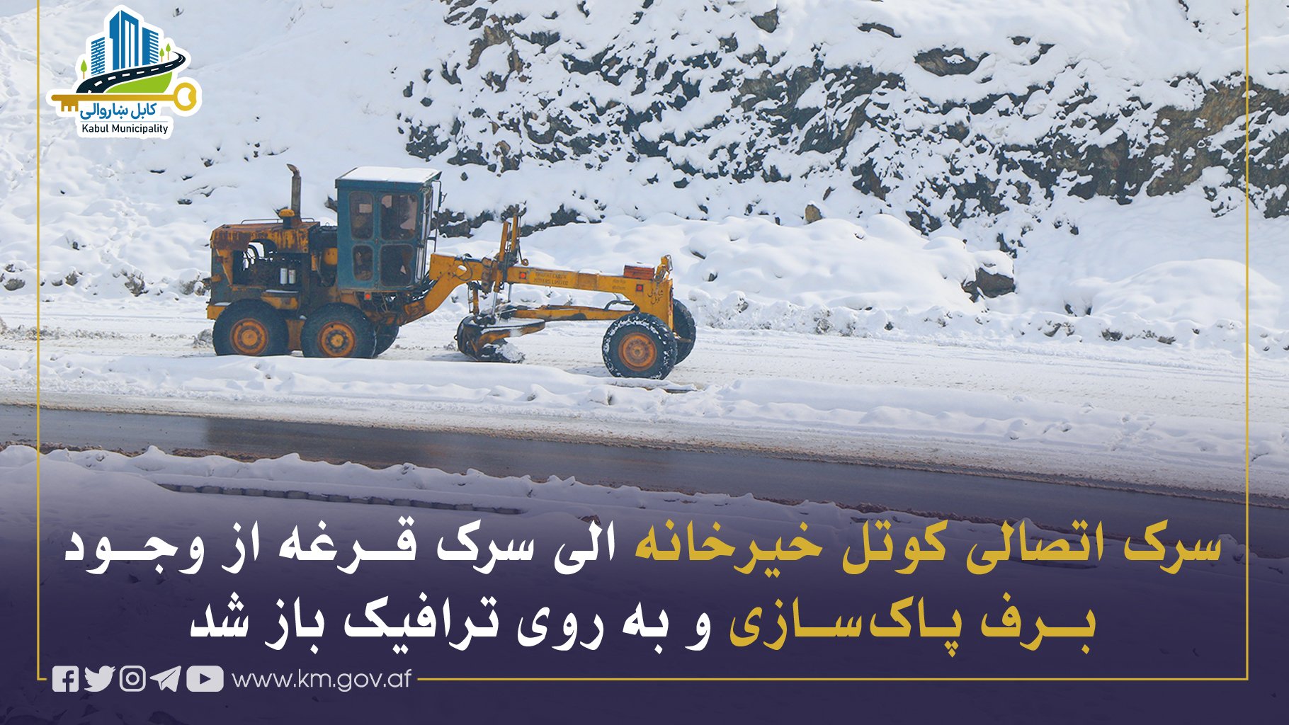 برف سرک اتصالی کوتل خیرخانه الی سرک قرغه از سوی پرسونل شاروالی کابل بهگونهٔ کامل پاکسازی گردید و هماکنون جریان ترافیک در این مسیر عادی میباشد.