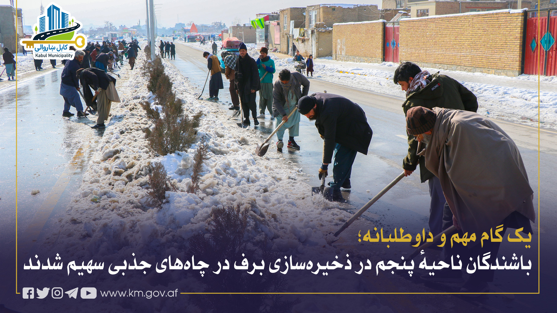 در پی درخواست شاروالی کابل، شماری از باشندگان ناحیهٔ پنجم با حفر چاههای جذبی و انتقال برف بهساحات قابل جذب، در تقویت آبهای زیرزمینی سهیم شدند.