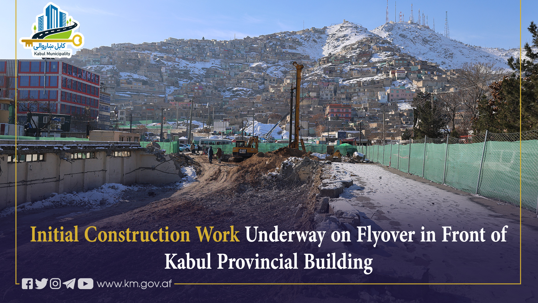 Initial construction work on a vehicle flyover in front of the Kabul Provincial administrative building is progressing in an organized manner under the supervision of the Directorate of Works Maintenance and Monitoring. Current activities include excavation, soil transportation, and reinforcement works.