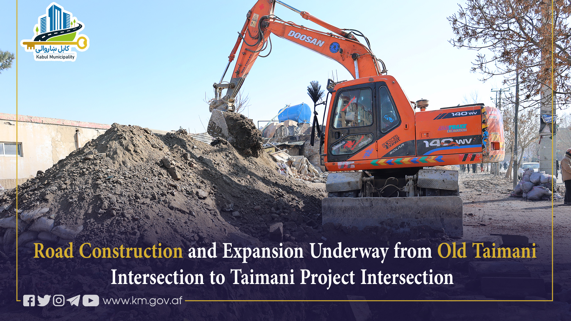 Road construction and expansion work from the Old Taimani intersection to the Taimani Project intersection in District 4 is currently in progress by Kabul Municipality. The road has a length of 610 meters and a width of 30 meters.