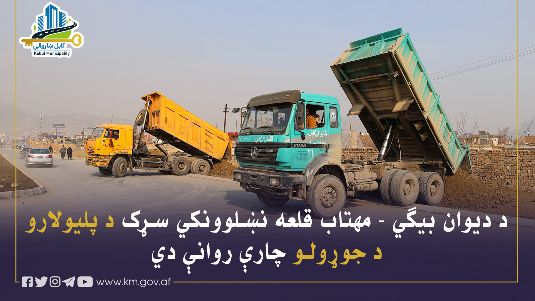د کابل ښاروالۍ د کار، ساتنې او مراقبت ریاست له خوا د پلیو تګ کوونکو لپاره د آسانتیاوو رامنځته کولو په موخه، د ۱۷۳۳ مترو په اوږدوالي او ۲.۲ مترو په سور سره د دېوان بیګي- مهتاب قلعه سړک د پلیو لارو د جوړولو چارې په منظمه توګه روانې دي.