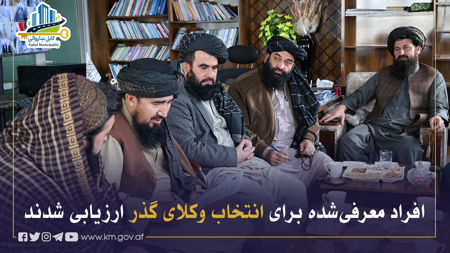 بهمنظور بررسی و ارزیابی افراد معرفیشده از نواحی ششم، هشتم، دهم، پانزدهم، هفدهم و نزدهم، جلسهٔ کمیتهٔ ارزیابی وکلای گذر بهریاست حاجی محمد نبی “عثمانی”، معین امور اجتماعی و فرهنگی شاروالی کابل، برگزار گردید.