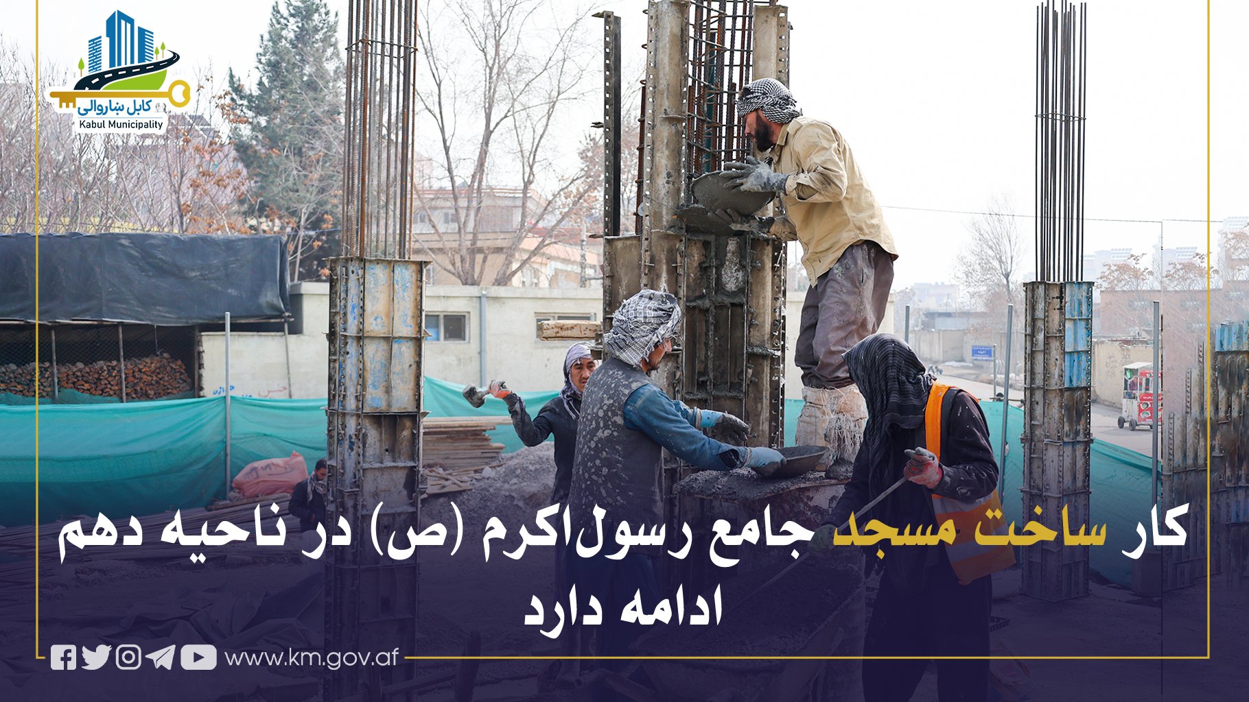 ریاست کار، حفظ و مراقبت شاروالی کابل کار اعمار اساسی مسجد جامع رسولاکرم صلیالله علیهوسلم را در مسیر سرک قلعه فتحالله، مربوط ناحیه دهم، روی دست دارد.