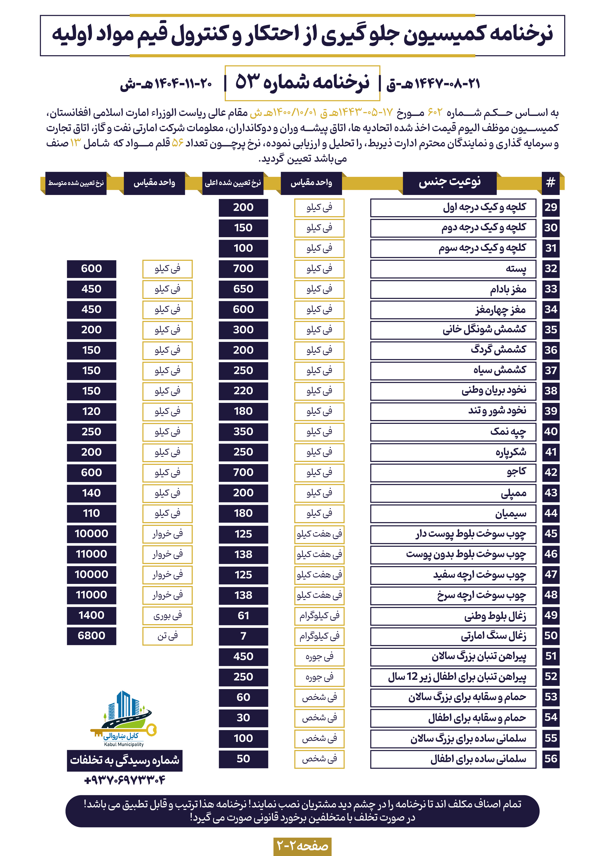 د نرخونو د کنټرول او له احتکار څخه د مخنیوي کمیسیون ۵۳ مه ګڼه نرخنامه