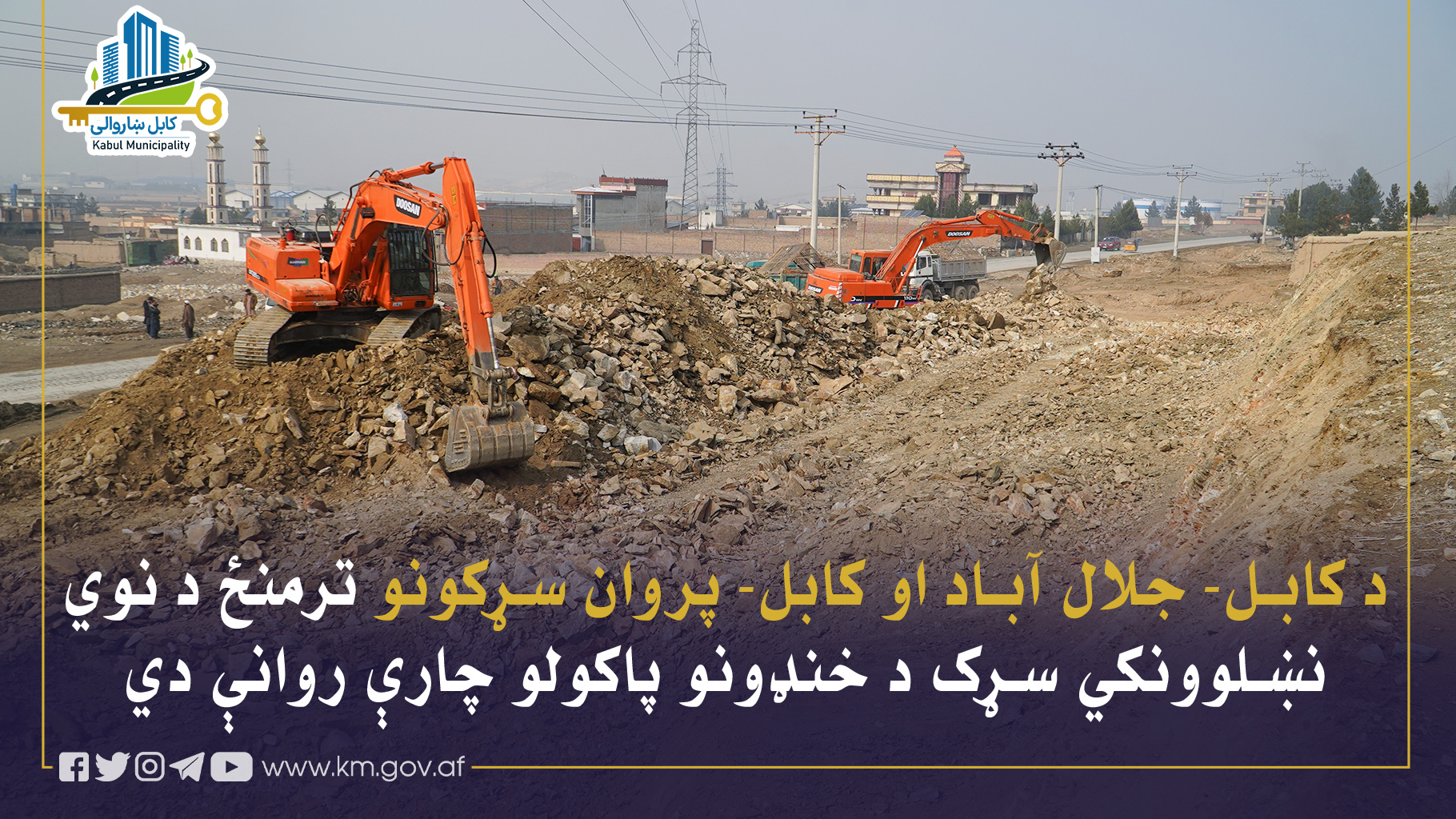 د کابل ښاروالۍ له لوري د نهمې، اتلسمې او نولسمې ناحیې اړوند د کابل- جلال آباد له سړک څخه تر صنعتي پارکونو او پر دوام یې د کابل- پروان تر سړک پورې د نوي نښلوونکي سړک د خنډونو پاکولو چارې روانې دي څو د اساسي طبقو جوړولو ته زمینه برابره شي.