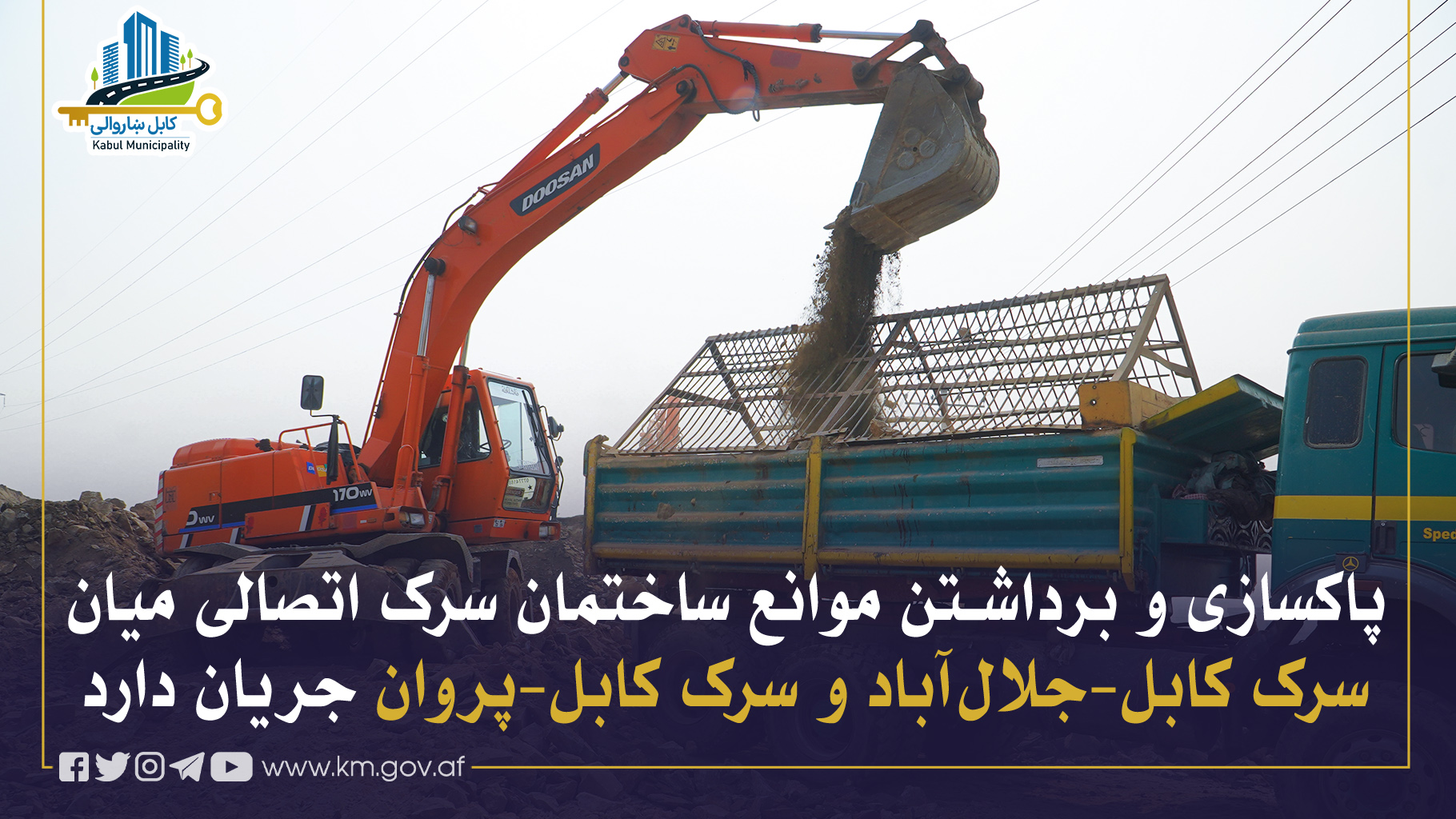 پاکسازی و برداشتن موانع ساختمان سرک جدید اتصالی از سرک کابل–جلالآباد تا پارکهای صنعتی و الی سرک کابل–پروان، در مربوطات نواحی نهم، هجدهم و نزدهم، از سوی شاروالی کابل جریان داشته تا زمینه کارهای اساسی این سرک فراهم شود.
