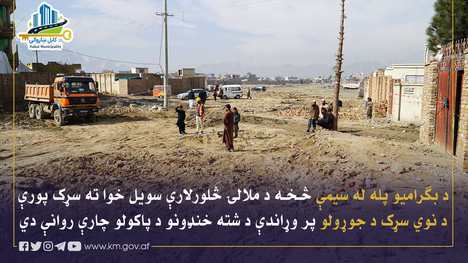 د اتمې او دوه ویشتمې ناحیې اړوند د بګرامیو پله له سیمې څخه د ملالۍ ( بت خاک) څلورلارې سویل خوا ته تر حلقوي سړک پورې د نوي نښلوونکي سړک لومړنۍ چارې روانې دي څو د سړک د اساسي طبقو جوړولو ته زمینه برابره شي.