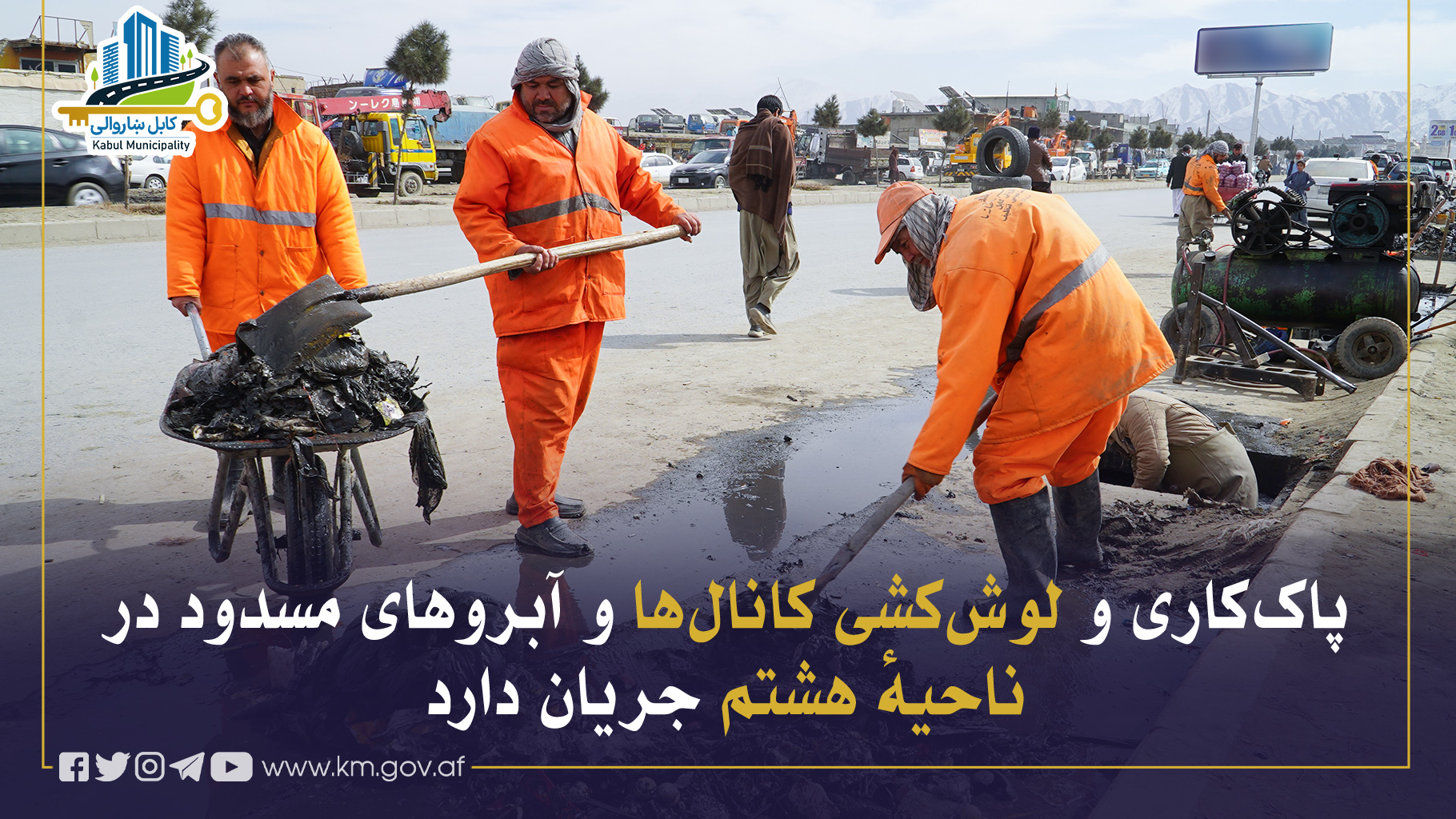بهمنظور مدیریت آبهای سطحی و جلوگیری از آبگرفتگیها، کار پاککاری و لوشکشی کانالها و آبروهای مسدود در نقاط مختلف ناحیهٔ هشتم از سوی ریاست تنظیف شاروالی کابل جریان دارد.