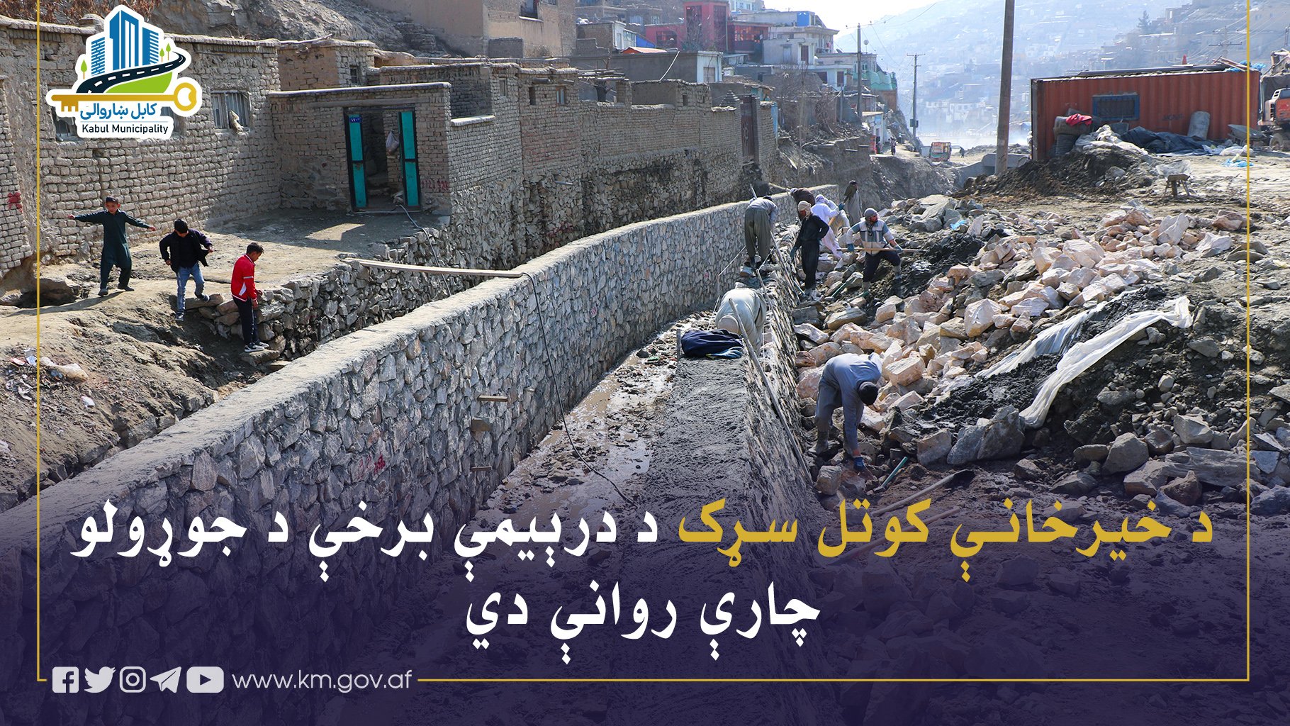 د کابل ښاروالۍ د کار، ساتنې او مراقبت ریاست له خوا د خیرخانې کوتل سړک د اساسي طبقو، استنادي دېوالونو او لښتیو د جوړولو چارې په منظمه توګه روانې دي.