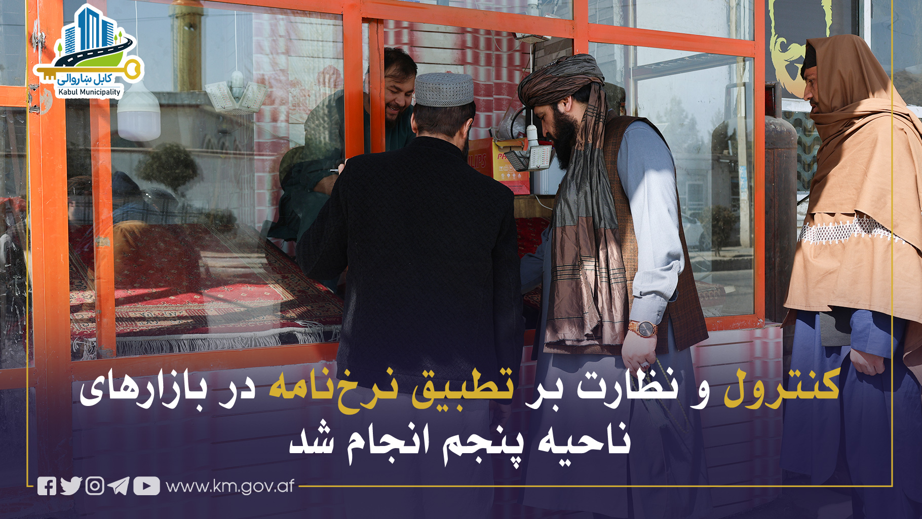 ریاست تنظیم مارکیتهای شاروالی کابل، بهمنظور تأمین ثبات قیمتها و جلوگیری از تخطی در فروش مواد اولیه، روند تطبیق نرخنامه شاروالی کابل را در بازارهای ناحیه پنجم بهصورت همهجانبه کنترول و نظارت نمود.