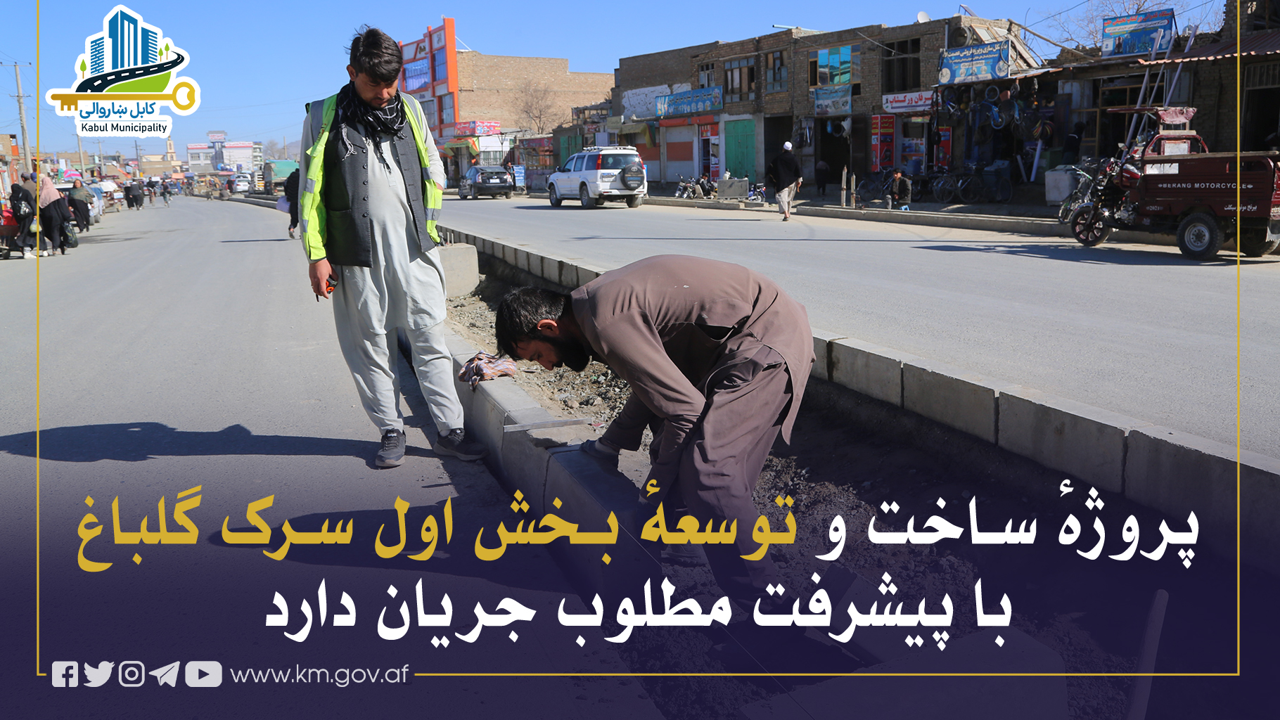 کارهای ساختمانی بخش اول سرک گلباغ با پیشرفت قابل ملاحظه ادامه داشته و در حال حاضر ساخت پیادهروها، اعمار گلدانها و سایر اجزای سرک بهگونهٔ منظم جریان دارد.
