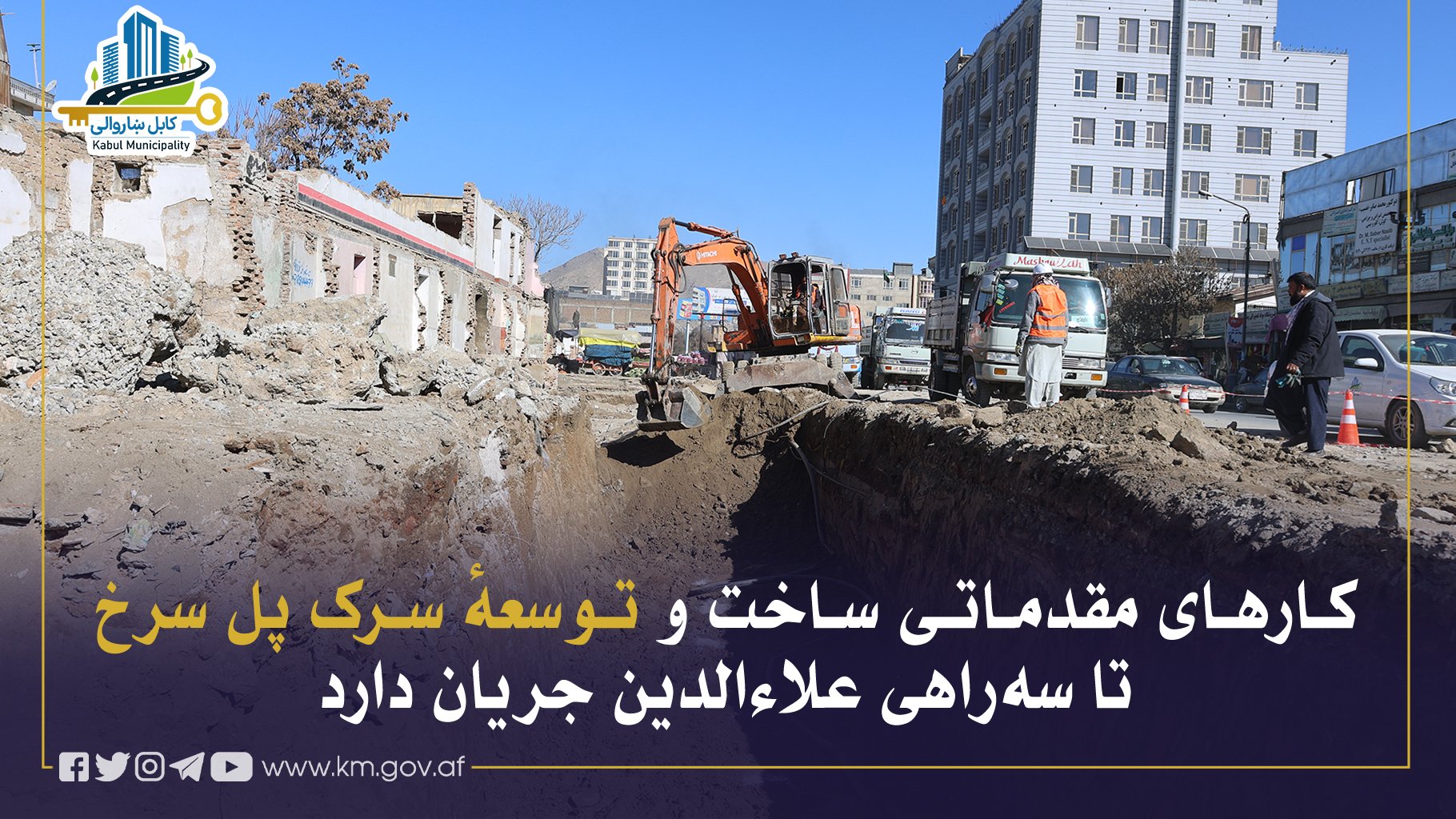 کارهای مقدماتی ساخت و توسعهٔ سرک پل سرخ تا سهراهی علاءالدین در مربوطات ناحیه ششم از سوی شاروالی کابل جریان داشته که شامل پاکسازی موانع باقیمانده، کندنکاری و خاکبرداری است.
