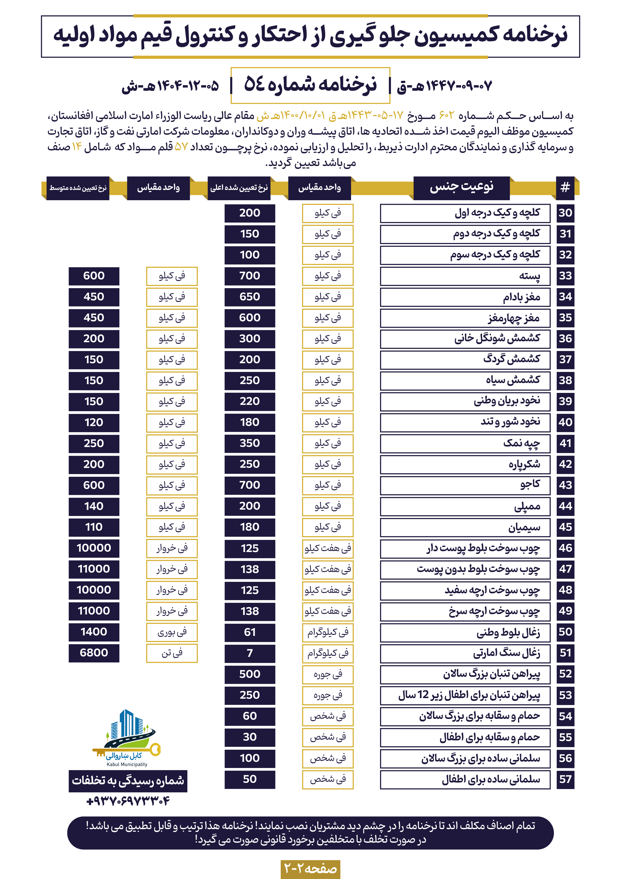 نرخنامه شماره ۵۴ کمیسیون جلوگیری از احتکار و کنترول قیم مواد اولیه