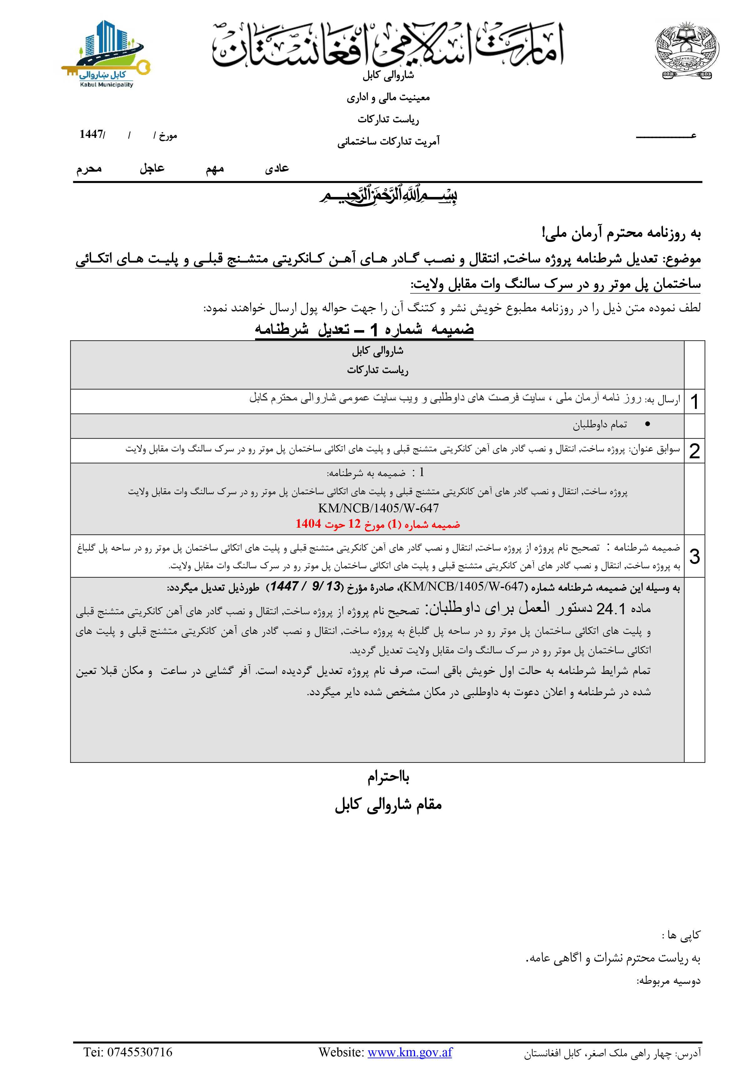 تیلفون سمع شکایات شاروالی کابل
