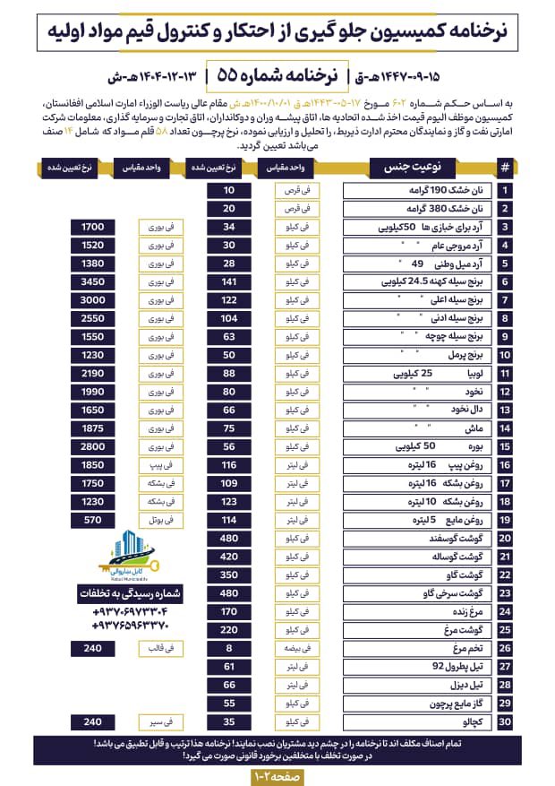 د نرخونو د کنټرول او له احتکار څخه د مخنیوي کمیسیون ۵۵ مه ګڼه نرخنامه!
